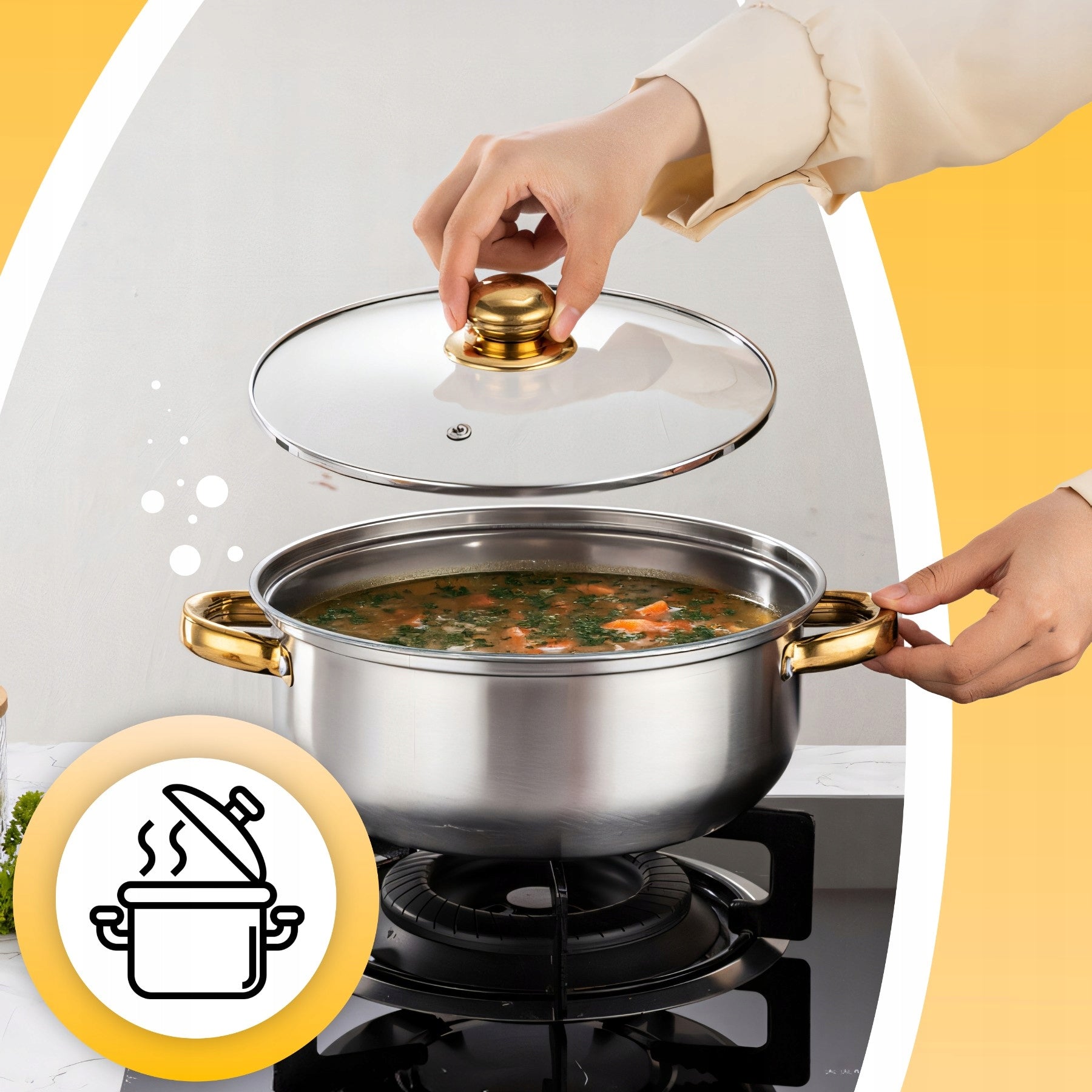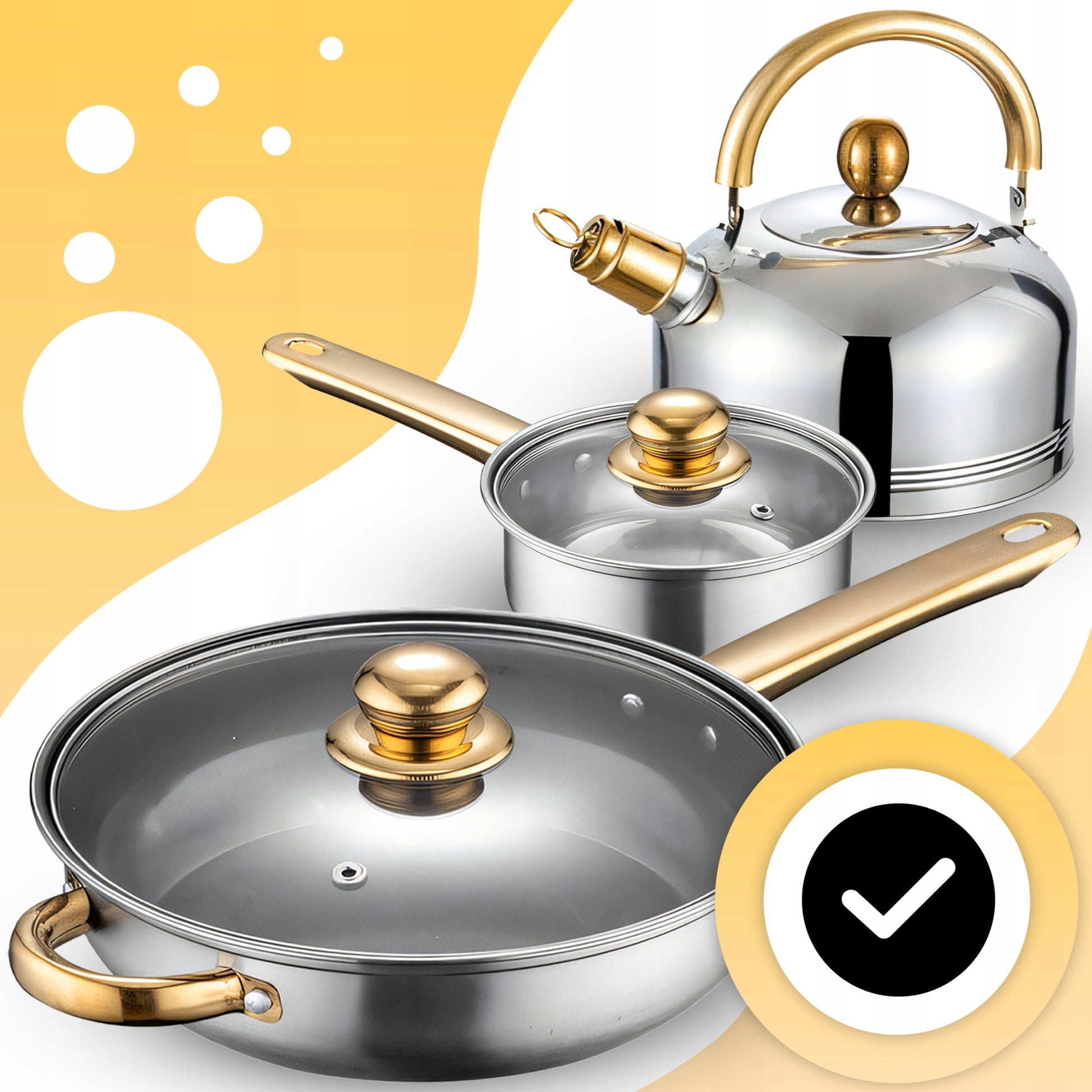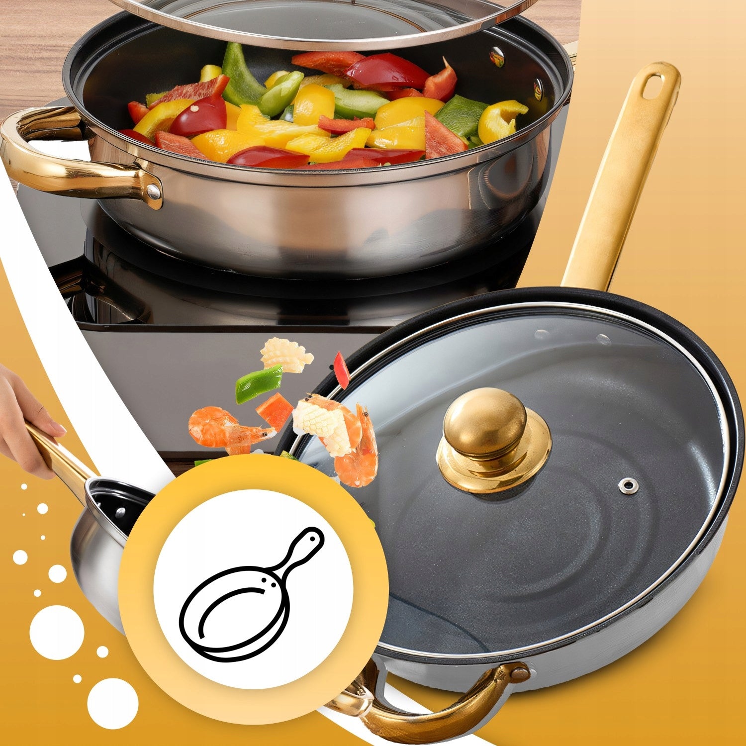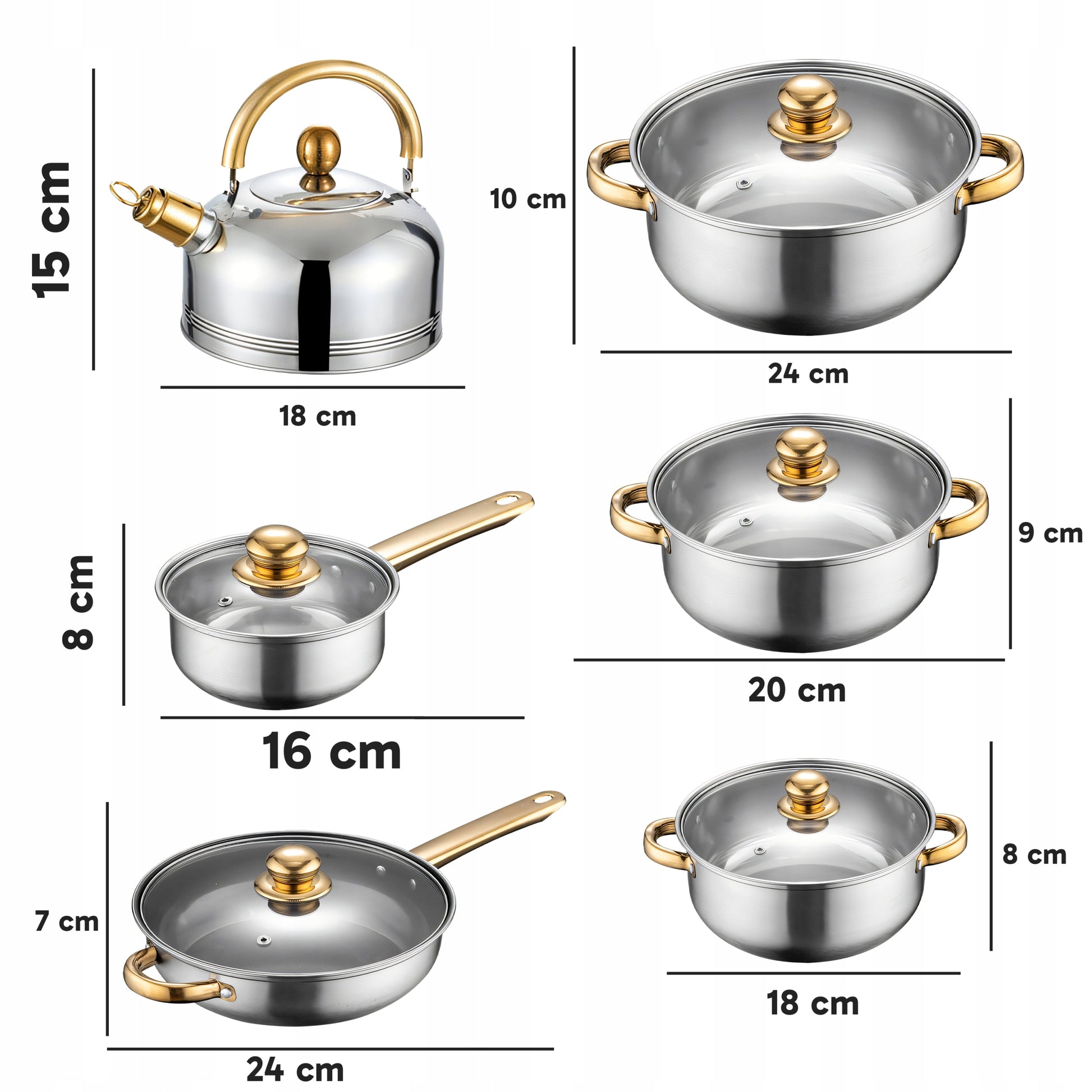 Šis puodų ir keptuvės rinkinys yra daugiau nei tik virtuvės įrankiai – tai jūsų kasdienės ruošimo patirties atnaujinimas. Kiekvienas elementas, nuo tvirtai pagamintų puodų iki elegantiško virdulio, sukurtas taip, kad tarnautų ilgus metus. Nerūdijančiojo plieno medžiaga užtikrina atsparumą korozijai ir lengvą priežiūrą, o vidinė nelipni danga leidžia gaminti sveikesnius patiekalus su mažesniu riebalų kiekiu ir be jokio maisto prilipimo. Unikalus dizainas su auksinėmis detalėmis pavers jūsų virtuvę stilingesne, o tvirta konstrukcija garantuos saugumą ir patikimumą naudojant.