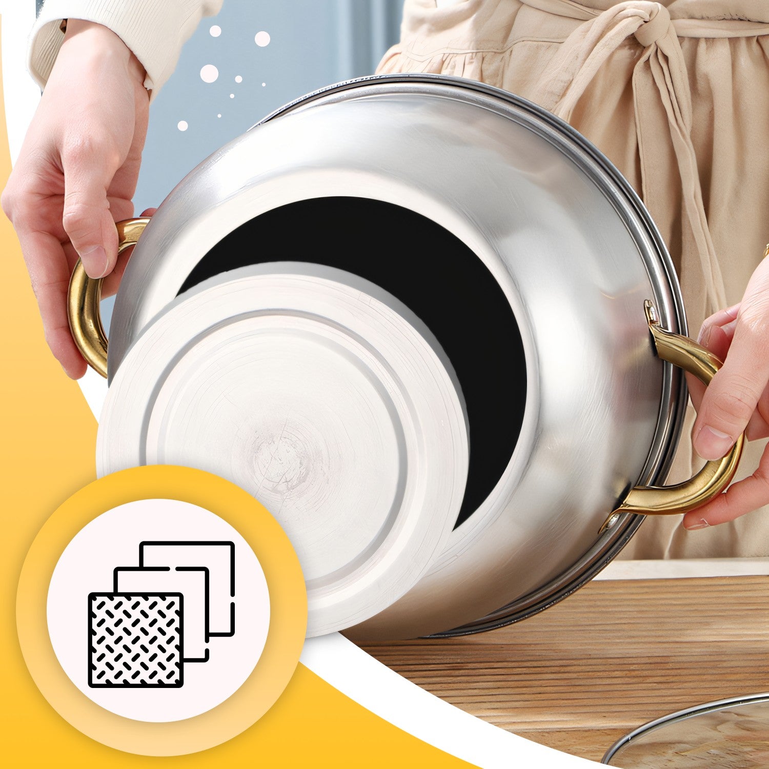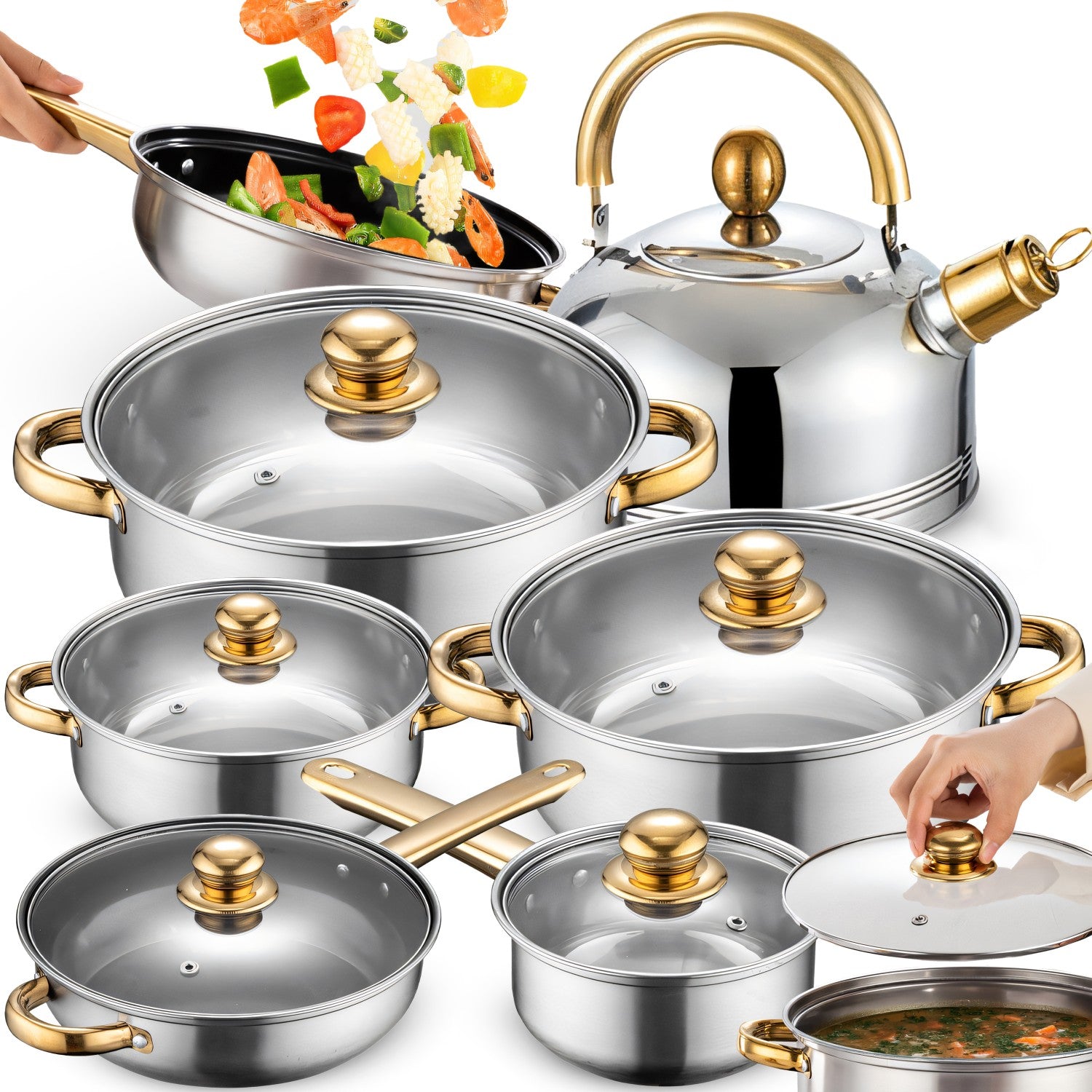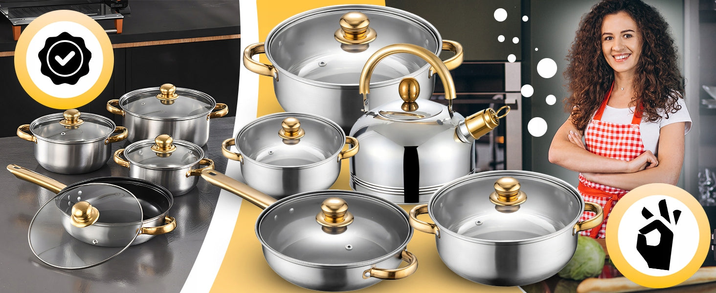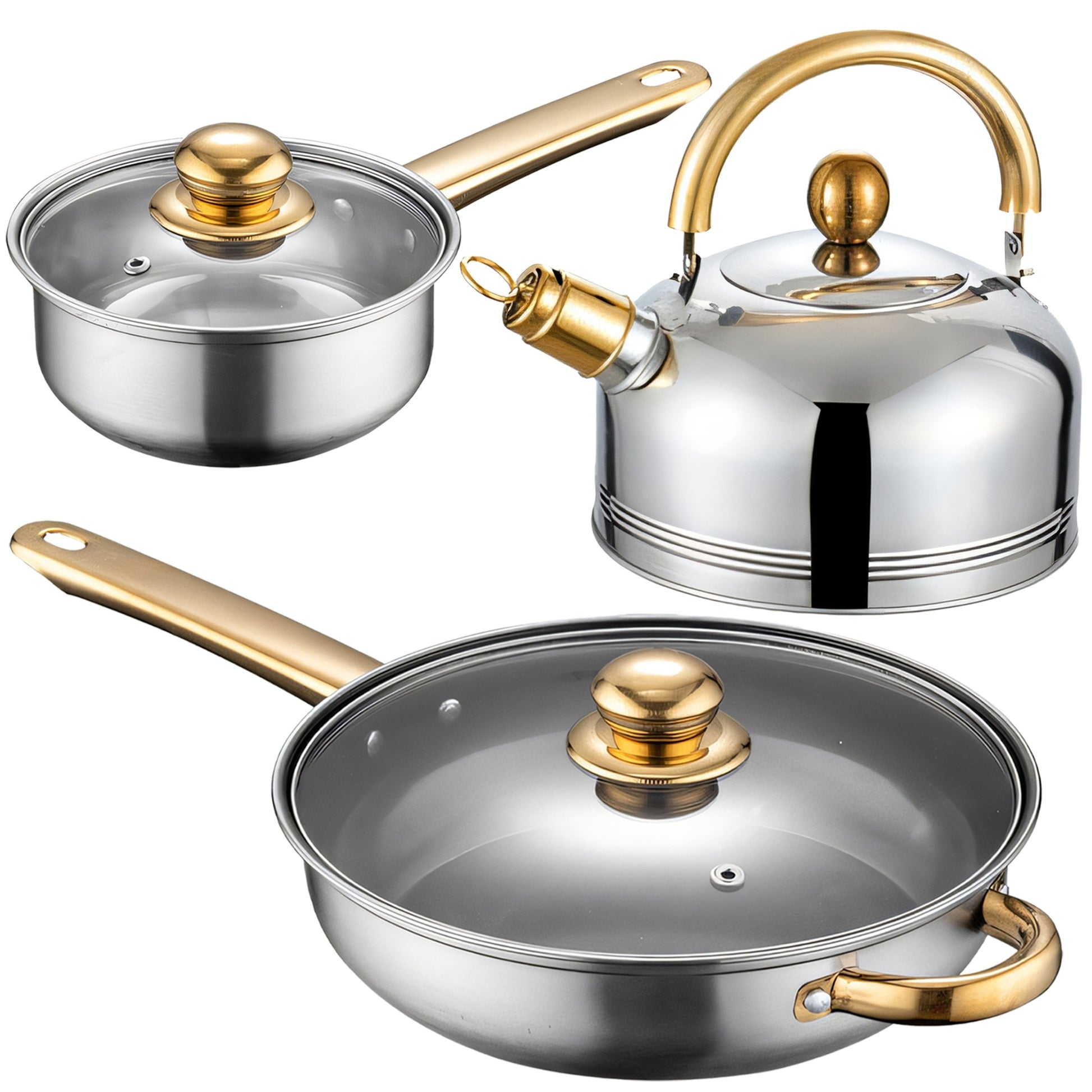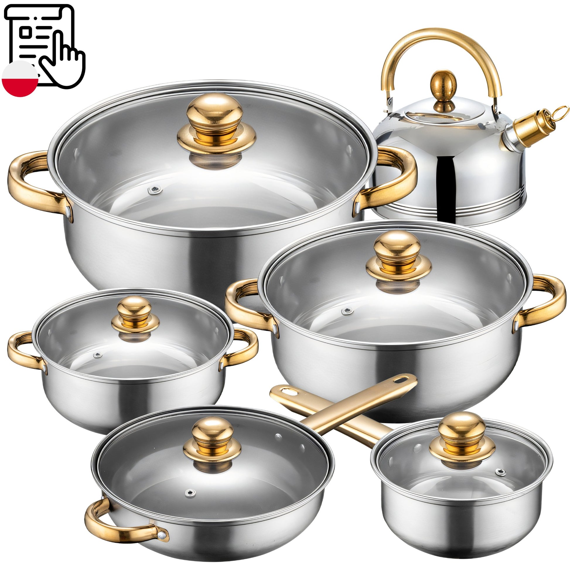 Šis puodų ir keptuvės rinkinys yra daugiau nei tik virtuvės įrankiai – tai jūsų kasdienės ruošimo patirties atnaujinimas. Kiekvienas elementas, nuo tvirtai pagamintų puodų iki elegantiško virdulio, sukurtas taip, kad tarnautų ilgus metus. Nerūdijančiojo plieno medžiaga užtikrina atsparumą korozijai ir lengvą priežiūrą, o vidinė nelipni danga leidžia gaminti sveikesnius patiekalus su mažesniu riebalų kiekiu ir be jokio maisto prilipimo. Unikalus dizainas su auksinėmis detalėmis pavers jūsų virtuvę stilingesne, o tvirta konstrukcija garantuos saugumą ir patikimumą naudojant.