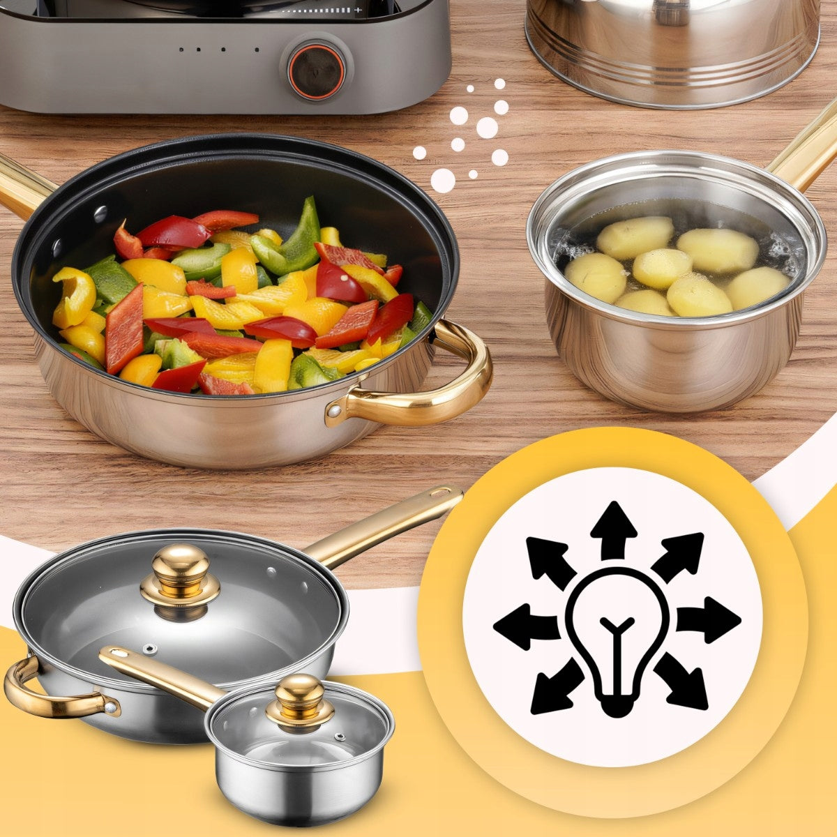Nesvarbu, kokia viryklė stovi jūsų virtuvėje, šis rinkinys yra tinkamas pasirinkimas. Jis veikia su dujinėmis, indukcinėmis, keraminėmis ir halogeninėmis kaitlentėmis, užtikrinant maksimalų universalumą. Specialiai sukurtas dugnas tolygiai paskirsto šilumą, todėl maistas ruošiamas greičiau ir efektyviau. Tai ideali galimybė tiems, kurie vertina lankstumą ir ieško patikimų įrankių įvairiems maisto ruošimo būdams – nuo troškinimo iki virimo ir kepimo.