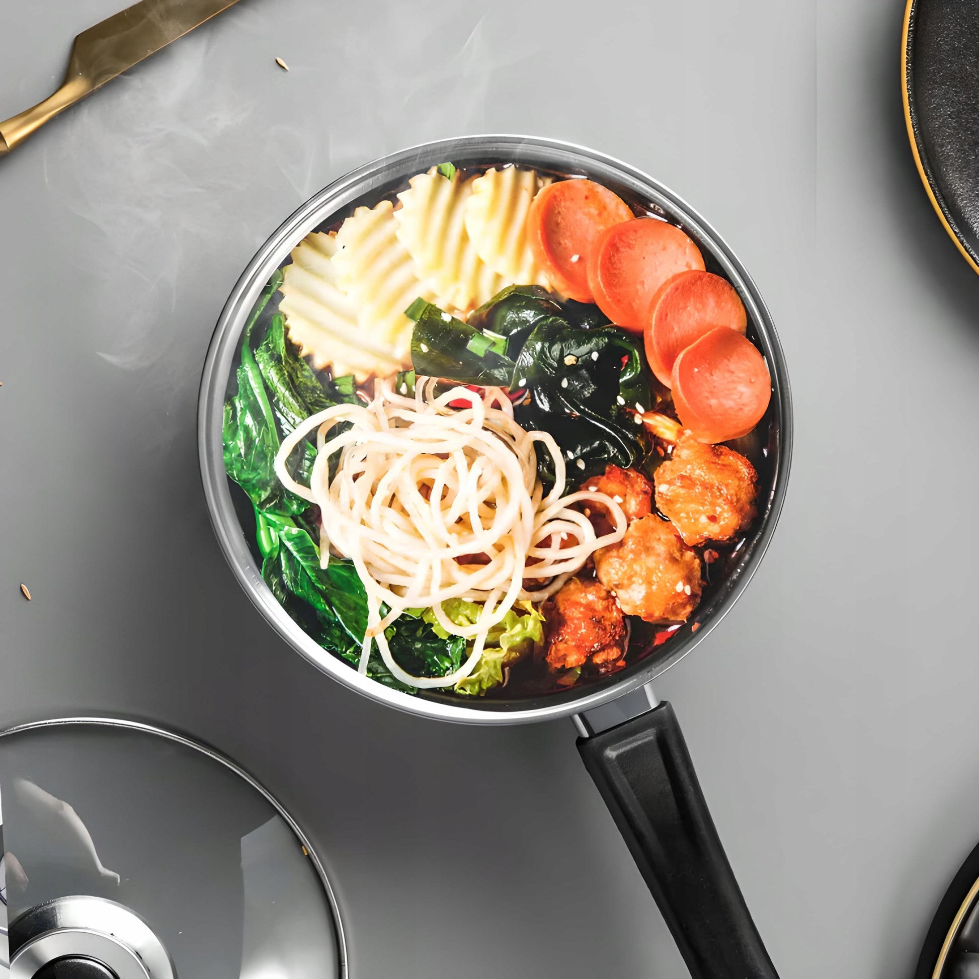 Šis išplėstinis 12 dalių rinkinys suteikia Jums visas reikalingas priemones įvairiausiems patiekalams ruošti – nuo kasdienių valgių iki šventinių vaišių. Kiekvienas indas yra kruopščiai suprojektuotas, kad užtikrintų optimalų maisto gaminimo procesą. Didžiausias puodas, kurio skersmuo 24 cm ir aukštis 9,5 cm, idealiai tinka sriuboms ar didesniems kiekiams gaminti. Keturi vidutiniai puodai (skersmenys 21,8 cm, 20 cm, 18 cm) puikiai tiks daržovėms, garnyrams ar kitiems patiekalams virti. Be to, rinkinyje rasite praktišką 16 cm skersmens puodelį (rondelį) ir universalią 24 cm skersmens keptuvę, kuri leis mėgautis skaniai iškeptais patiekalais. Šis pilnas komplektas leis Jums patenkinti visus maisto ruošimo poreikius.