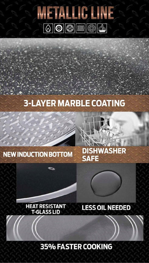 Kiekviena Berlinger Haus keptuvė iš Metallic Line serijos yra kruopščiai sukurta tam, kad jūsų gaminimo patirtis būtų nepriekaištinga. Unikali granito danga, praturtinta granito dulkėmis, yra ne tik itin atspari įbrėžimams ir trinčiai, bet ir pasižymi puikiomis nelimpančiomis savybėmis, panašiomis į natūralų akmenį. Ši danga leidžia maistui neprilipti ir padeda išsaugoti jo natūralų skonį bei maistingąsias savybes. Dėl specialios konstrukcijos ir efektyvios šilumos perdavimo sistemos, keptuvės greitai įkaista ir ilgai išlaiko šilumą, o tai leidžia sutaupyti iki 35% energijos dėka „Turbo Induction“ technologijos. Ergonomiški, švelnūs liesti (Soft-Touch) silikoniniai rankenėliai užtikrina patogų ir saugų naudojimą, nesukaista gaminimo metu.