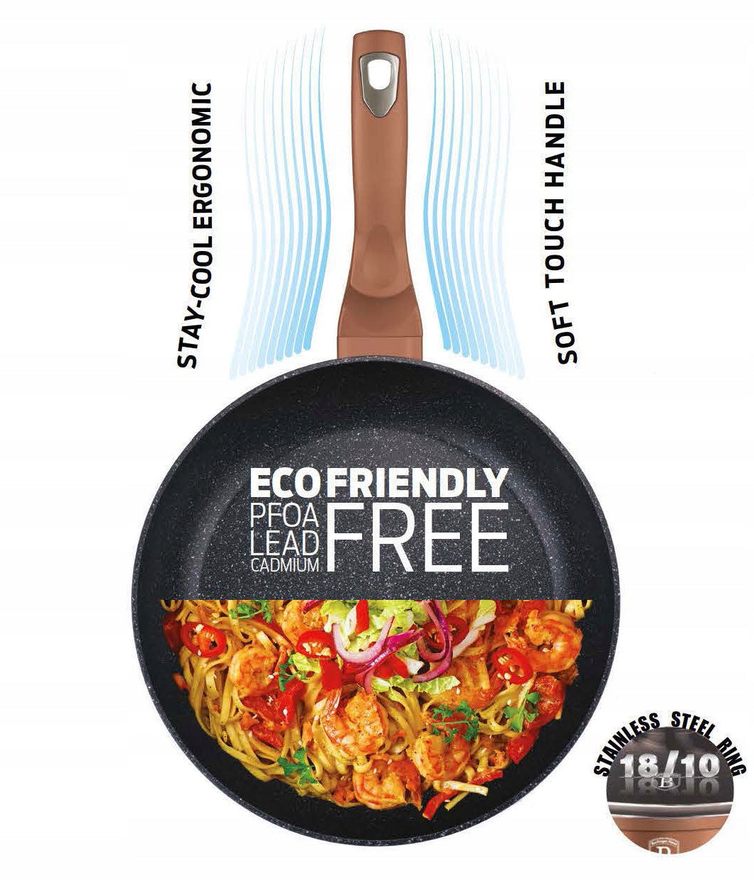 Privalumai:Aukščiausios kokybės granito nelimpanti danga – maistas nepridega, lengva prižiūrėti. Tvirtas kalto aliuminio korpusas – ilgaamžis ir gerai paskirsto šilumą. Atsparumas įbrėžimams – leidžia ilgai išlaikyti nepriekaištingą išvaizdą. „Turbo Induction“ technologija – taupo energiją ir greičiau įkaista. Elegantiškas „Rosegold“ dizainas – puikiai papildo modernią virtuvę. Tinka visoms viryklėms, įskaitant indukcinę. Galima plauti indaplovėje. Švelnios liesti silikoninės rankenėlės – patogus ir saugus laikymas.