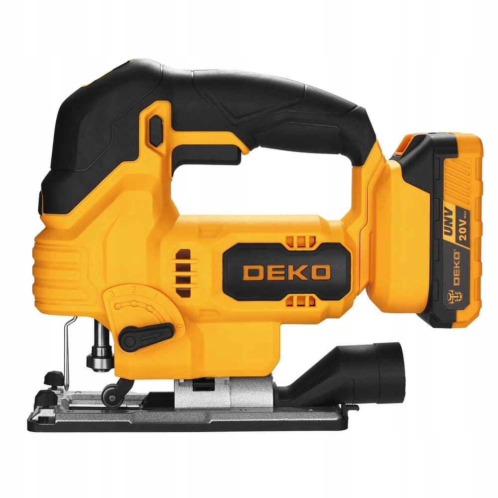 DEKO DKJS20Q1Y dėlionė varoma 20V akumuliatoriumi, kurio talpa siekia 2000 mAh, užtikrinant pakankamą galią atlikti net sudėtingiausius darbus. Prietaisas leidžia atlikti iki 100 mm gylio pjūvius medienoje ir iki 6 mm plieno storio. Jums nereikės rūpintis papildomu maitinimo šaltiniu – vienas pilnai įkrautas akumuliatorius leis dirbti ilgą laiką. Įrankis turi net 6 greičio reguliavimo pakopas ir 4 svyravimo reguliavimo pakopas, leidžiančias preciziškai pritaikyti pjovimo parametrus skirtingoms medžiagoms ir užduotims. Taip pat galėsite atlikti kampinius pjūvius 0, 22,5 ir 45 laipsnių kampu į kairę ir dešinę, o sklandžiai reguliuojama pado plokštė užtikrina tikslumą.
