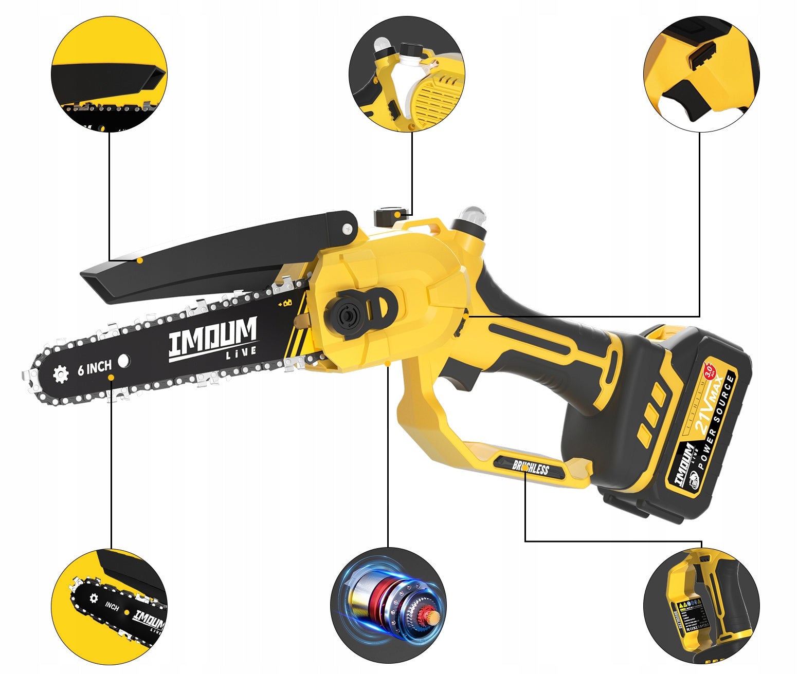 Akumuliatoriniai grandininiai pjūklai, tokie kaip IMOUM DLJS6 PRO, suteikia nepaprastą laisvę ir mobilumą. Pamirškite benzino maišymą ir ilgus kabelius – tiesiog įdėkite įkrautą akumuliatorių ir pradėkite darbą. Šis modelis, aprūpintas 21V sistema ir aukštos kokybės 3000 mAh talpos akumuliatoriais, užtikrina ilgą veikimo laiką tarp įkrovimų. Bešepetėlis variklis ne tik taupo energiją, bet ir yra patvaresnis, reikalauja mažiau priežiūros bei dirba tyliau ir vėsiau.