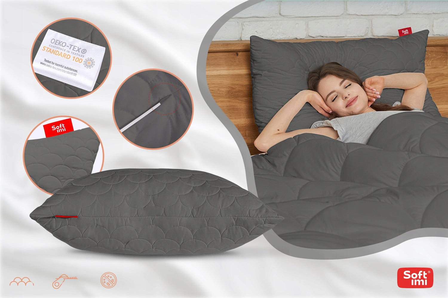 Kiekviena mūsų pagalvė yra 100% pagaminta Lenkijoje, mūsų nuosavoje siuvykloje, kurioje didelis dėmesys skiriamas kiekvienai smulkmenai. Naudojame tik aukščiausios kokybės, sertifikuotus OEKO-TEX® audinius ir neaustinius pluoštus, kurie garantuoja ne tik ilgaamžiškumą, bet ir visišką saugumą jūsų sveikatai. Užpildas – specialus, pirminio (ne perdirbto) pluošto antialerginis pūkas, kuris suteikia minkštumo ir purumo, panašaus į natūralų pūką, tačiau be alerginių reakcijų rizikos. Mikrofibra yra itin švelni ir maloni liesti, puikiai praleidžia orą ir sugeria drėgmę.