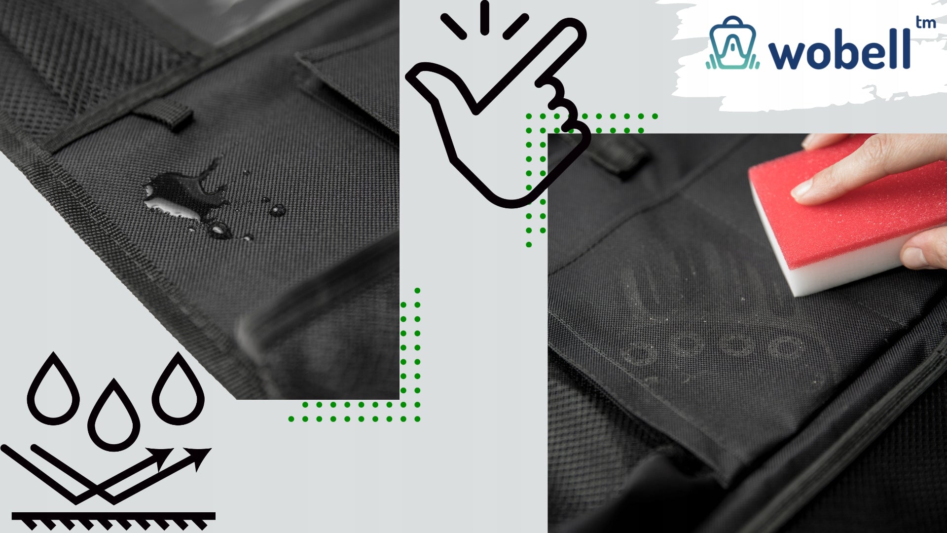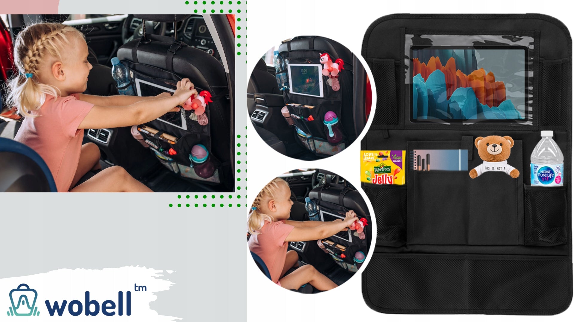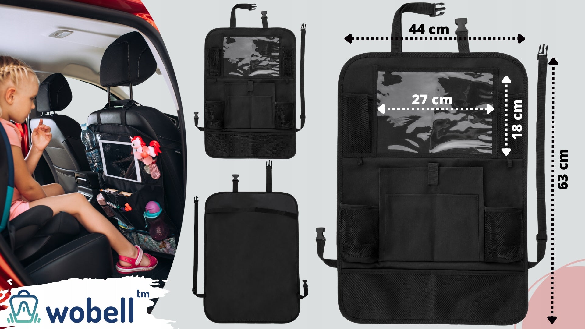 Wobell organizatorius pasižymi dideliu talpumu ir funkcionalumu, siūlydamas septynias skirtingas kišenes, skirtas įvairiems daiktams laikyti. Jame rasite erdvią, skaidrią kišenę, specialiai pritaikytą planšetiniam komputeriui (iki 18x27 cm), kuri leidžia vaikams patogiai žiūrėti filmukus ar žaisti žaidimus kelionės metu, nereikalaujant papildomo laikiklio. Taip pat yra šešios tinklinės kišenės, idealiai tinkančios buteliukams, servetėlėms, knygelėms ar smulkiems žaislams laikyti. Papildoma kišenė su lipuku leis saugiai paslėpti didesnius ar svarbesnius daiktus.