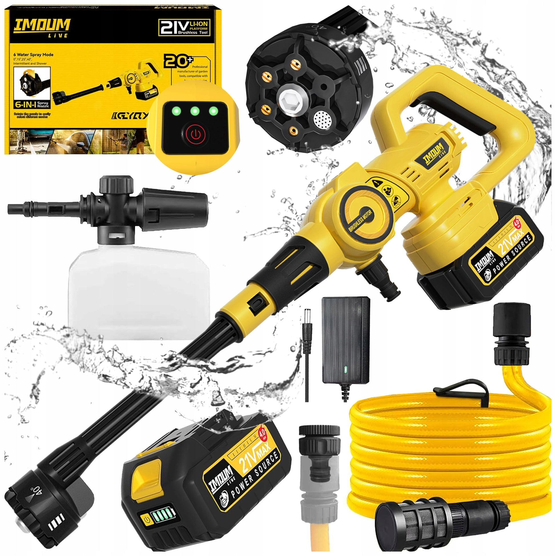 Kad galėtumėte pradėti valyti iškart po įsigijimo, IMOUM komplektas „XXL“ apima viską, ko gali prireikti. Čia rasite ne tik pačią plovyklą ir galingą 4000 mAh 21V Li-Ion akumuliatorių su įkrovikliu, bet ir visą reikiamą priedų rinkinį, užtikrinantį universalią veiklą. Specialus 6-in-1 antgalis, putų generatorius su talpa, 5 metrų ilgio vandens tiekimo žarna su filtru ir greita jungtimi – viskas apgalvota iki smulkmenų.