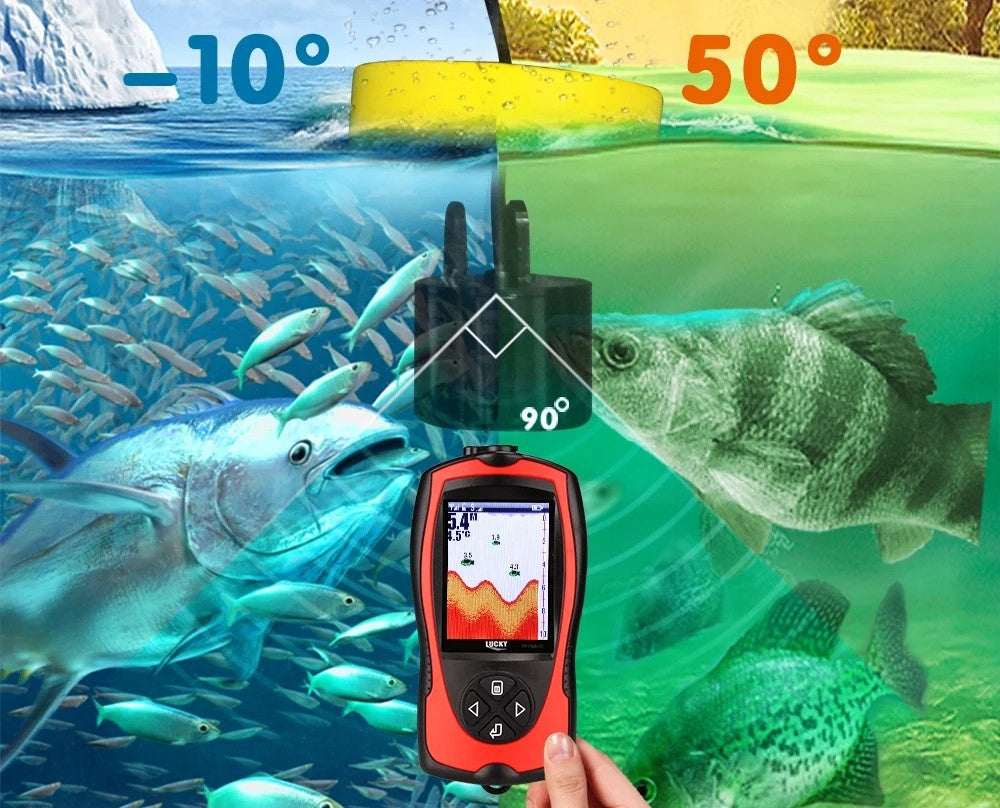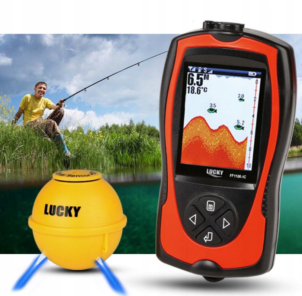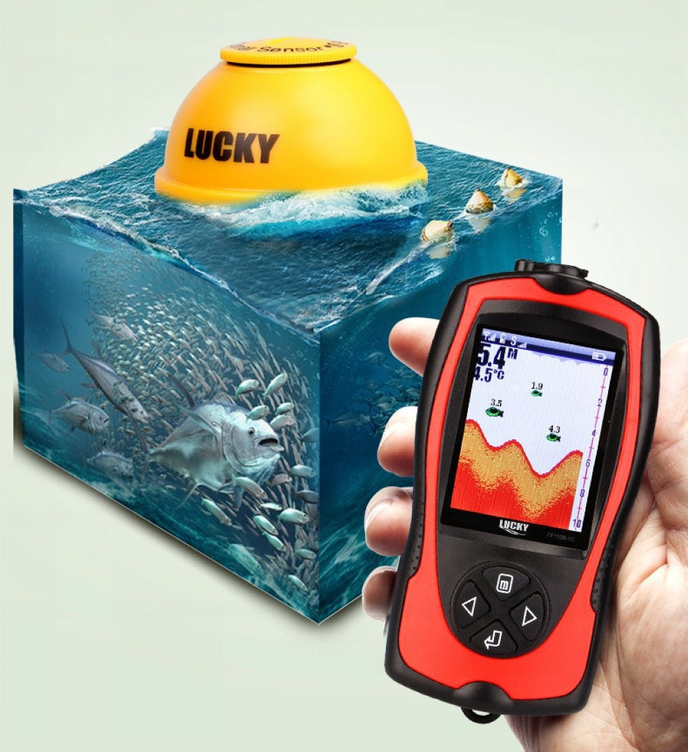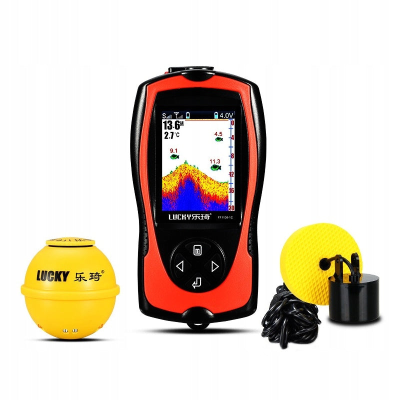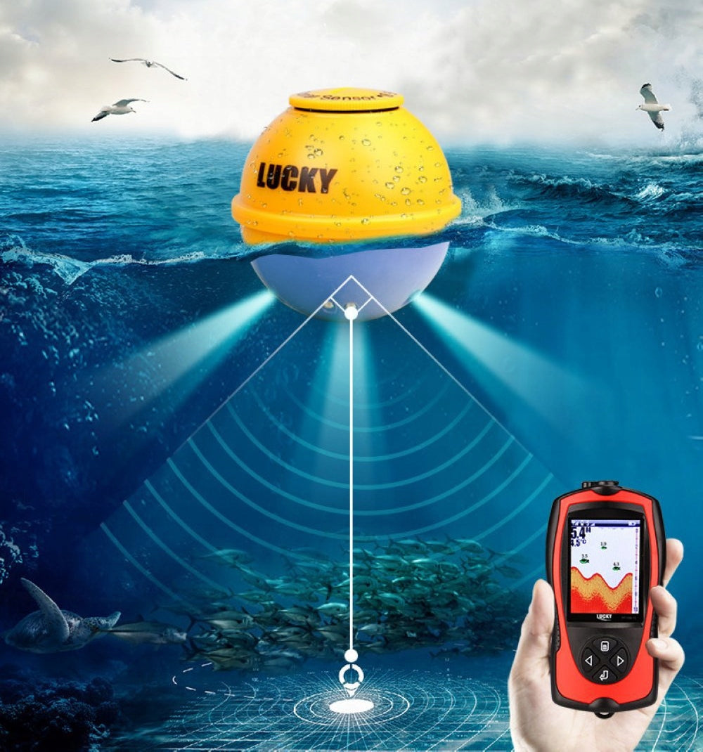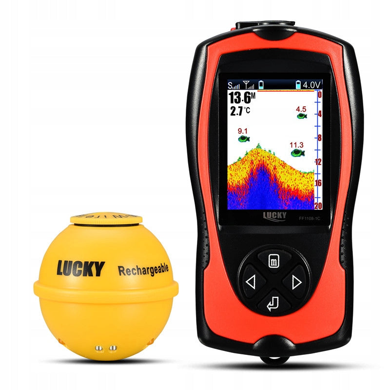Belaidis žvejybinis echolotas LUCKY 100m su pavojaus signalu, skirtas žvejybiniams laiveliams
