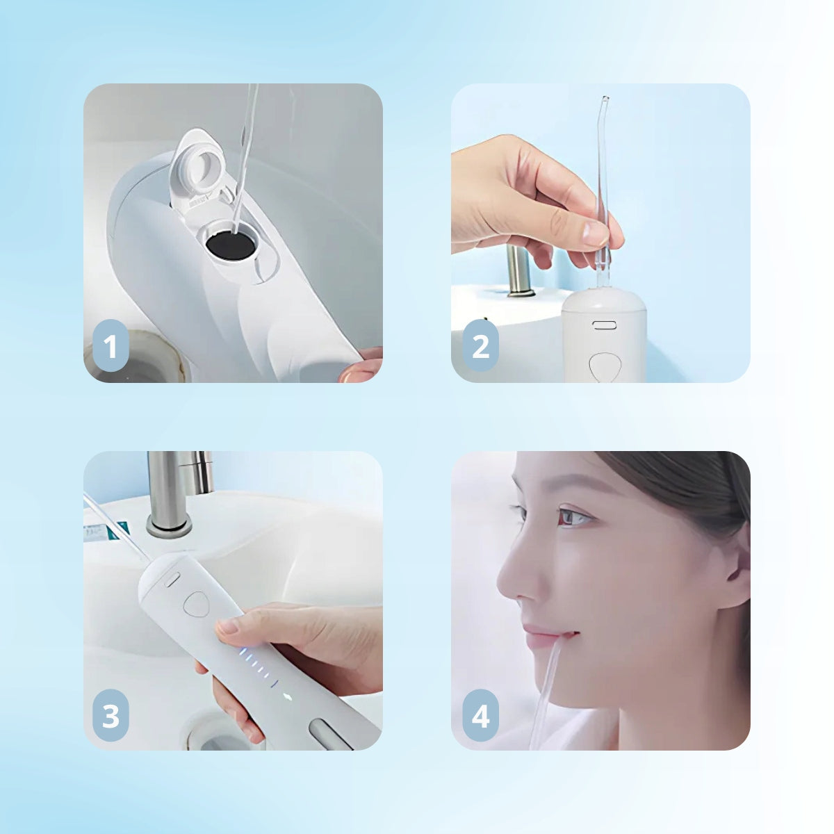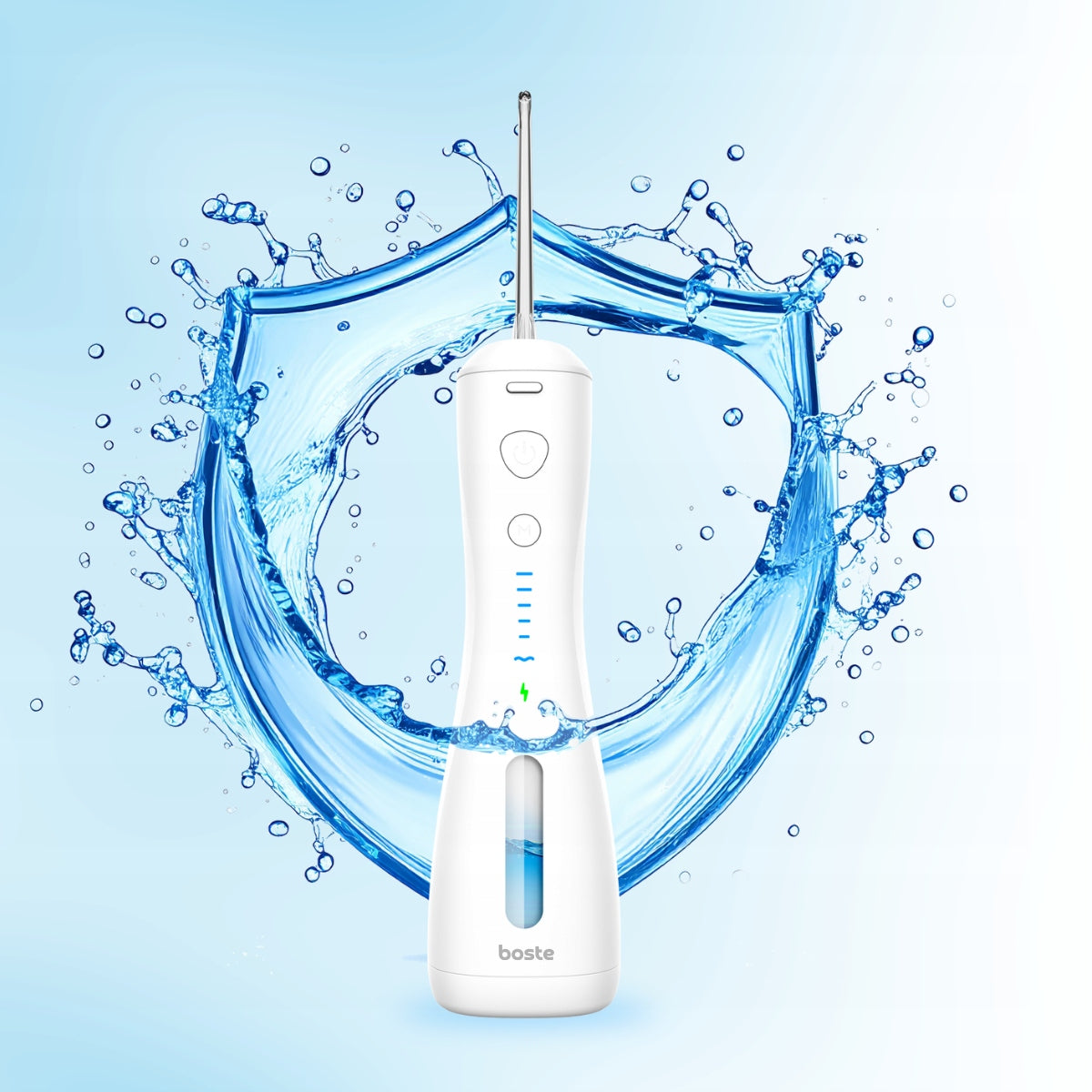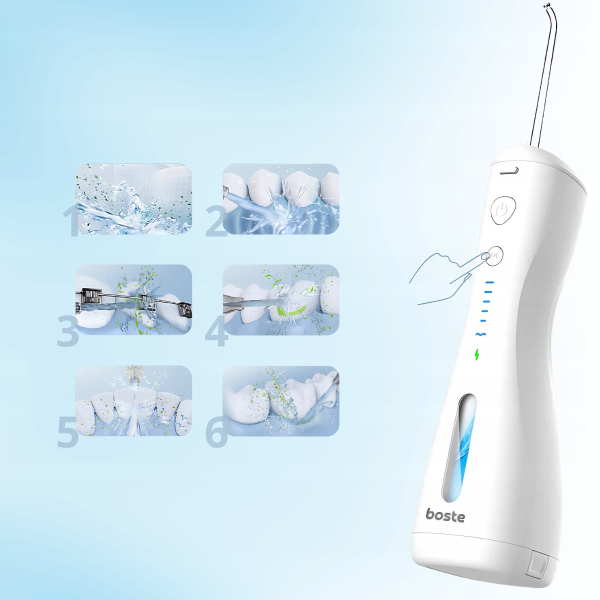 Atraskite pažangiausią burnos priežiūrą su belaidžiu Boste M1 irigatoriumi. Sukurtas atsižvelgiant į modernius poreikius, šis prietaisas su 6 darbo režimais ir 4 specializuotais antgaliais efektyviai pašalina maisto likučius, apnašas ir bakterijas iš sunkiausiai pasiekiamų vietų – tarpdančių, dantenų linijos ir liežuvio. Naudodamas pulsacinę technologiją (1600 pulsų/min) ir iki 140 PSI siekiantį vandens slėgį, Boste M1 užtikrina gilų valymą, gaivų kvapą ir sveikesnes dantenas. 360° besisukantis antgalis, 240 ml talpos vandens rezervuaras ir visiškas IPX7 atsparumas vandeniui leidžia mėgautis patogumu ir nepriekaištinga švara kiekvieną dieną, netgi naudojant jį duše. Tai idealus sprendimas žmonėms, nešiojantiems breketus, turintiems implantus, vainikėlius ar jautrias dantenas.