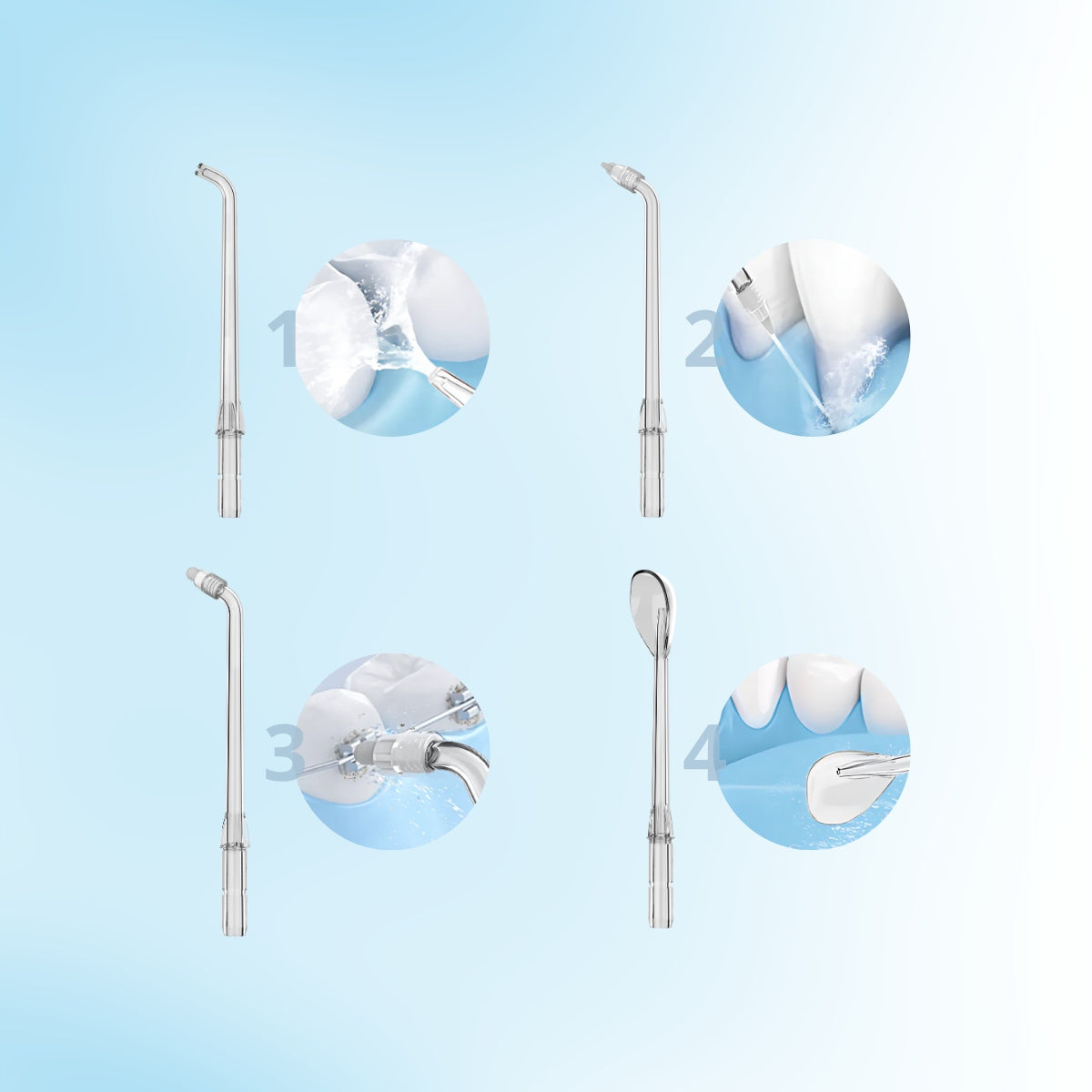 - 4 keičiami antgaliai: Standartinis, periodontologinis, ortodontinis ir liežuvio valymo antgaliai leidžia spręsti įvairias burnos priežiūros problemas.