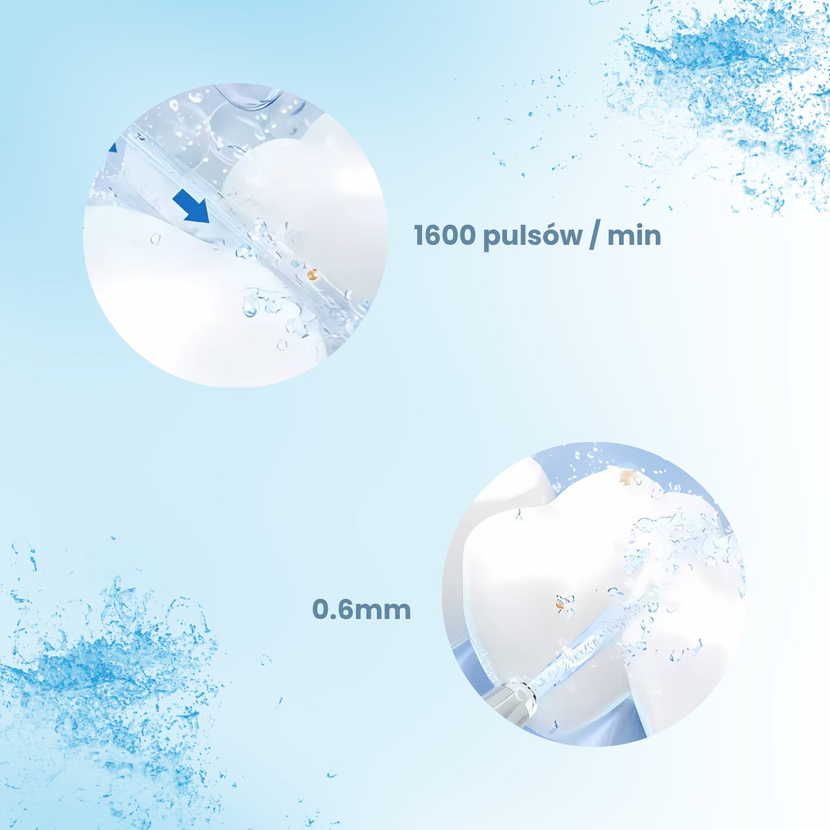 - 1600 pulsų/min ir 140 PSI slėgis: Užtikrina itin efektyvų maisto likučių ir apnašų šalinimą iš tarpdančių ir dantenų vagelių.