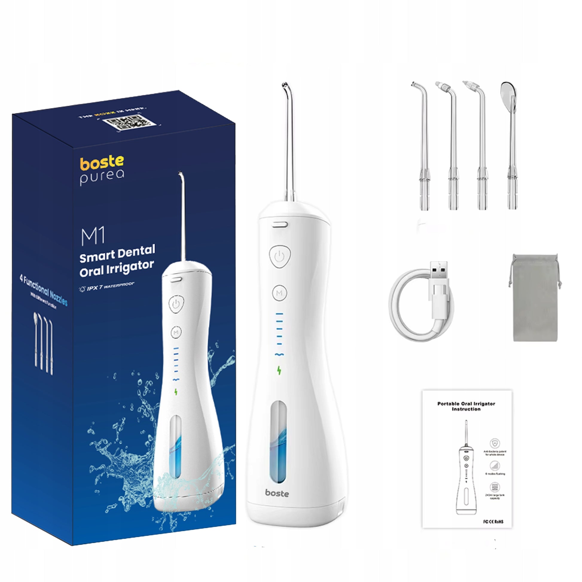 Boste M1 irigatorius yra kruopščiai sukomplektuotas, kad atitiktų visus jūsų burnos priežiūros poreikius. Kartu su pagrindiniu įrenginiu gausite keturis skirtingus antgalius, kiekvienas skirtas specifinei burnos ertmės daliai ar būklei.