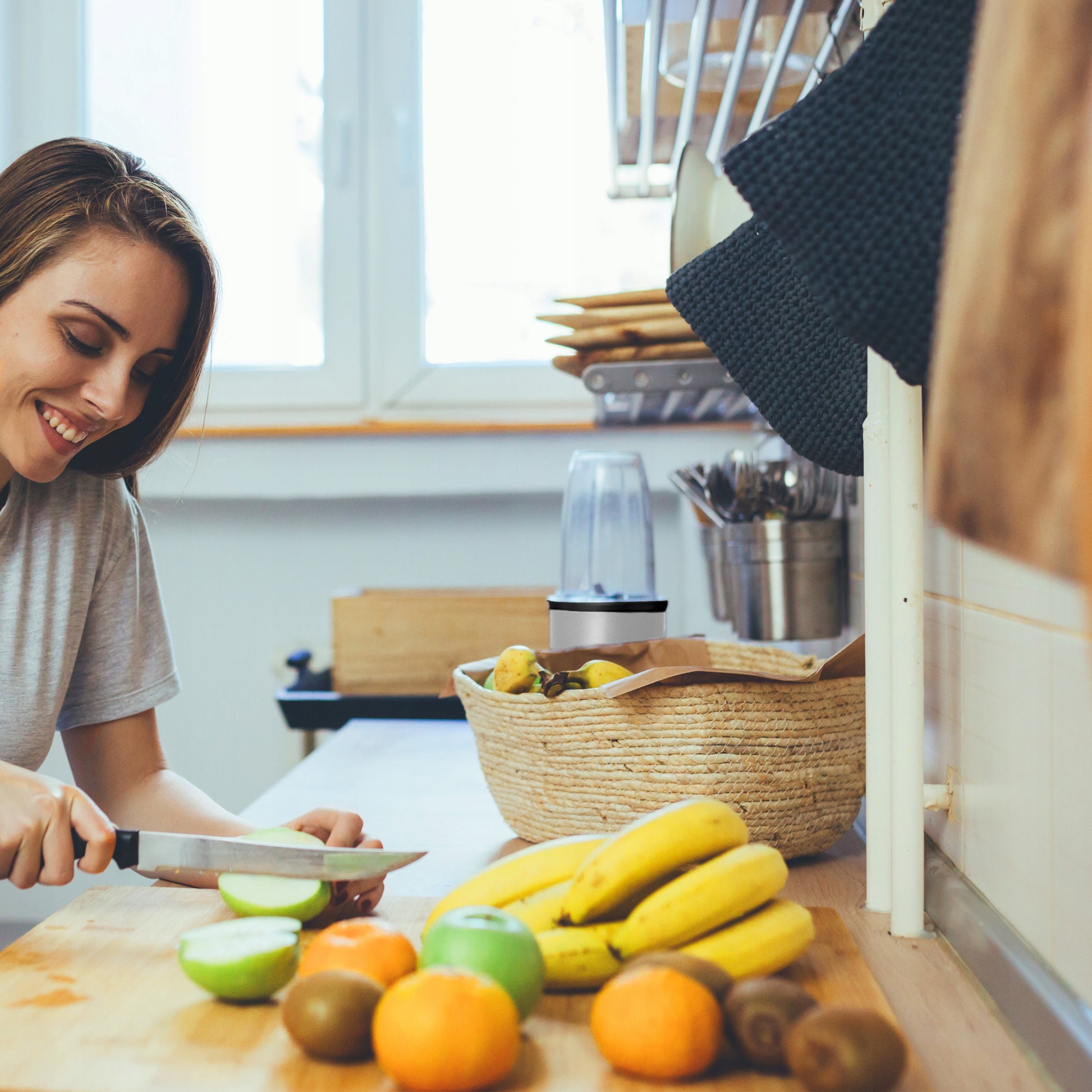Mūsų virtuvinis robotas sukurtas atsižvelgiant į modernias virtuvės erdves, kur vietą taupyti yra itin svarbu. Jis puikiai įsipaišys bet kuriame kampelyje, neapkraunant kitų prietaisų. Be to, jo kompaktiški matmenys daro jį idealų kelionių palydovu, nes du pridedami 470 ml talpos puodeliai leis jums mėgautis mėgstamais naminiais kokteiliais net keliaujant.