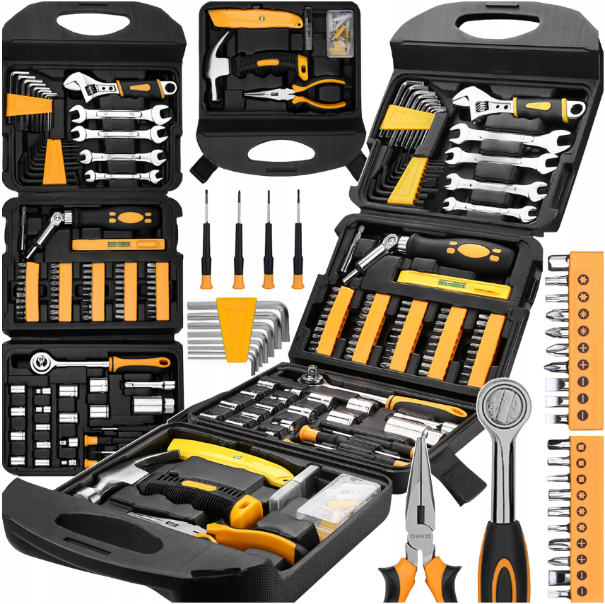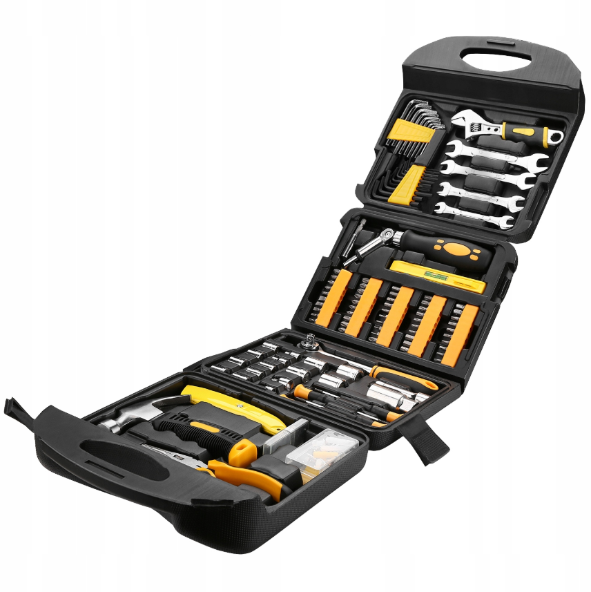 165 dalių įrankių rinkinys — išsami meistro kolekcija, idealiai tinka remontui, automobilių priežiūrai, montavimui ir buities darbams. Komplektą sudaro raktai, antgaliai įvairioms galvutėms (PH, PZ, TORX, imbus), prailginimai, bitai, gręžtuvai, bei daugybė priedų, o visi įrankiai patogiai išdėstyti tvirtame lagamine – rogių nešaunamas pritaikytas laikymas.
