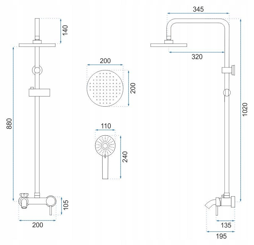 - Lietaus dušo skersmuo: 200 mm