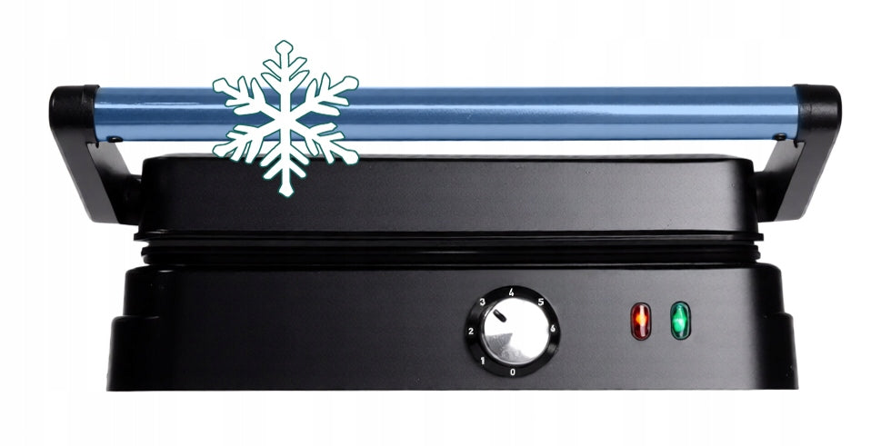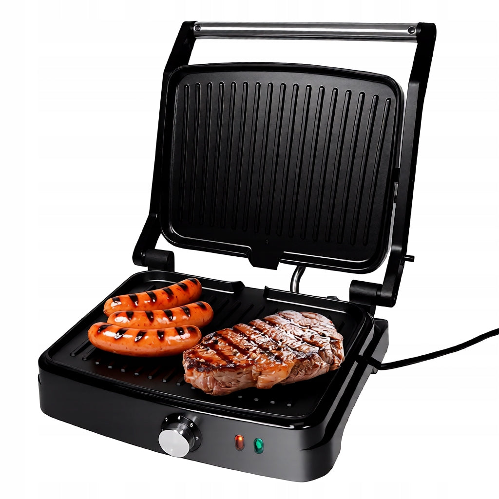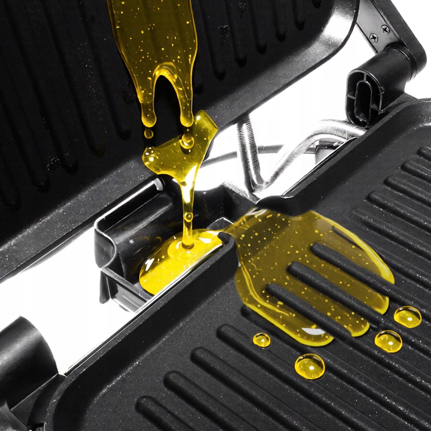 Unikalus prietaiso dizainas su metaliniais, judančiais vyriais, leidžia griliui atsidaryti 180 laipsnių kampu. Tai suteikia galimybę naudoti abi kaitinimo plokštes vienu metu, dvigubai padidinant kepimo plotą, arba pasirinkti tik vieną plokštę, jei ruošiate mažiau produktų. Vyrių konstrukcija taip pat leidžia reguliuoti viršutinės plokštės atstumą nuo maisto, prisitaikant prie skirtingo maisto storio – nuo plonų sumuštinių iki stambių burgerių, taip išvengiant jų suspaudimo. Neslystančios kojelės užtikrina stabilumą, o termiškai izoliuota rankena – saugų ir patogų prietaiso atidarymą. Papildomai, integruota riebalų surinkimo talpa padeda išlaikyti švarą ruošiant maistą.