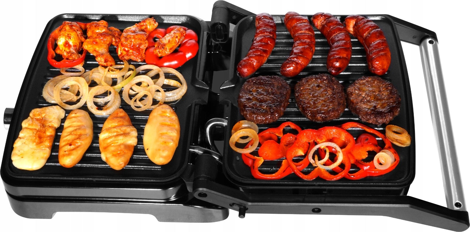 - 180° atsidarymas: Didelis kepimo plotas, leidžia ruošti daugiau maisto vienu metu arba naudoti kaip atvirą grilių.