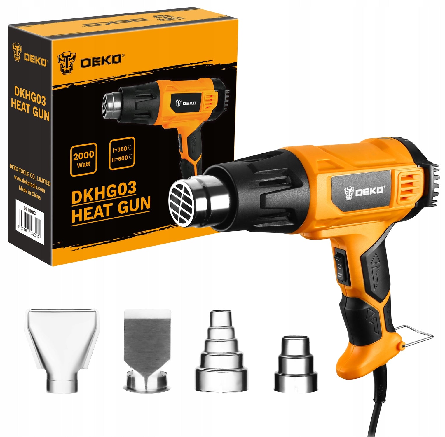 Kad galėtumėte nedelsiant pradėti darbus, DEKO DKHG03 komplektacijoje rasite viską, ko reikia įvairioms užduotims atlikti. Opalarka yra kruopščiai sukomplektuota su keturiais skirtingais antgaliais, kiekvienas jų pritaikytas konkrečiam darbui, užtikrinant maksimalų efektyvumą ir kontrolę. Įrankio dizainas apgalvotas iki smulkmenų – nuo patogios, neslystančios rankenos iki atlenkiamos atraminės kojelės, kuri leidžia stabiliai pastatyti įrankį atvėsti ar pakabinti jį ne darbo metu.