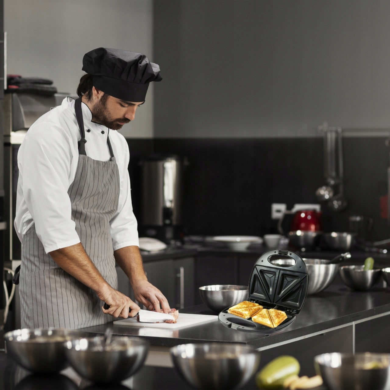 Saugumas yra mūsų prioritetas. Šis sumuštinių keptuvas turi integruotą termostatą ir LED indikatoriaus lemputę, kuri informuoja, kada prietaisas paruoštas naudoti. Nenušylančios plastikinės rankenos užtikrina visišką saugumą naudojimo metu, apsaugodamos nuo nudegimų. Tvirtas spaustukas padeda saugiai uždaryti keptuvą ruošimo metu. Naudojimas ir priežiūra yra itin paprasti, todėl tapsite tikru virtuvės šefu be didelių pastangų.