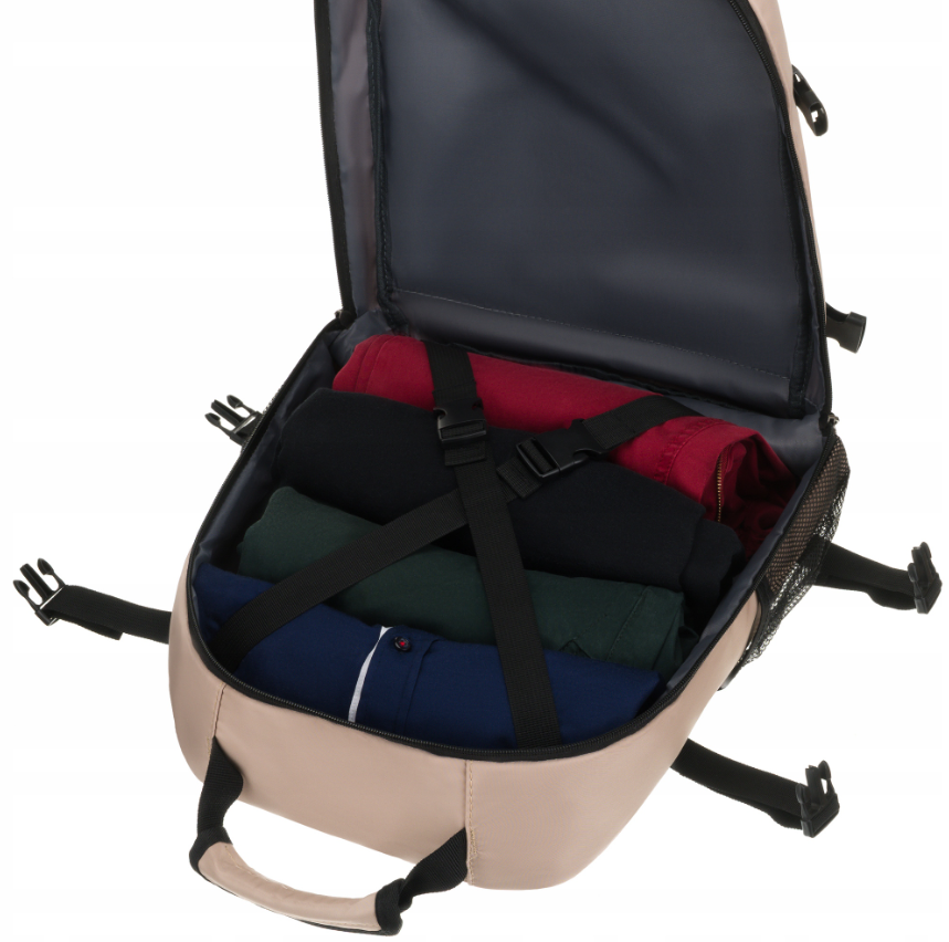 Kuprinę sudaro standi konstrukcija, kuri padeda išlaikyti formą net pilnai užkrauta. Medžiagos – aukštos kokybės, atsparios drėgmei ir dėvėjimuisi, tad kelionėse tarnaus patikimai. Viduje rasite pagrindinį skyrių su dirželiais, kad daiktai nesimėtytų, bei kelias papildomas kišenes smulkmenoms: dokumentams, telefonui, įkrovikliui.