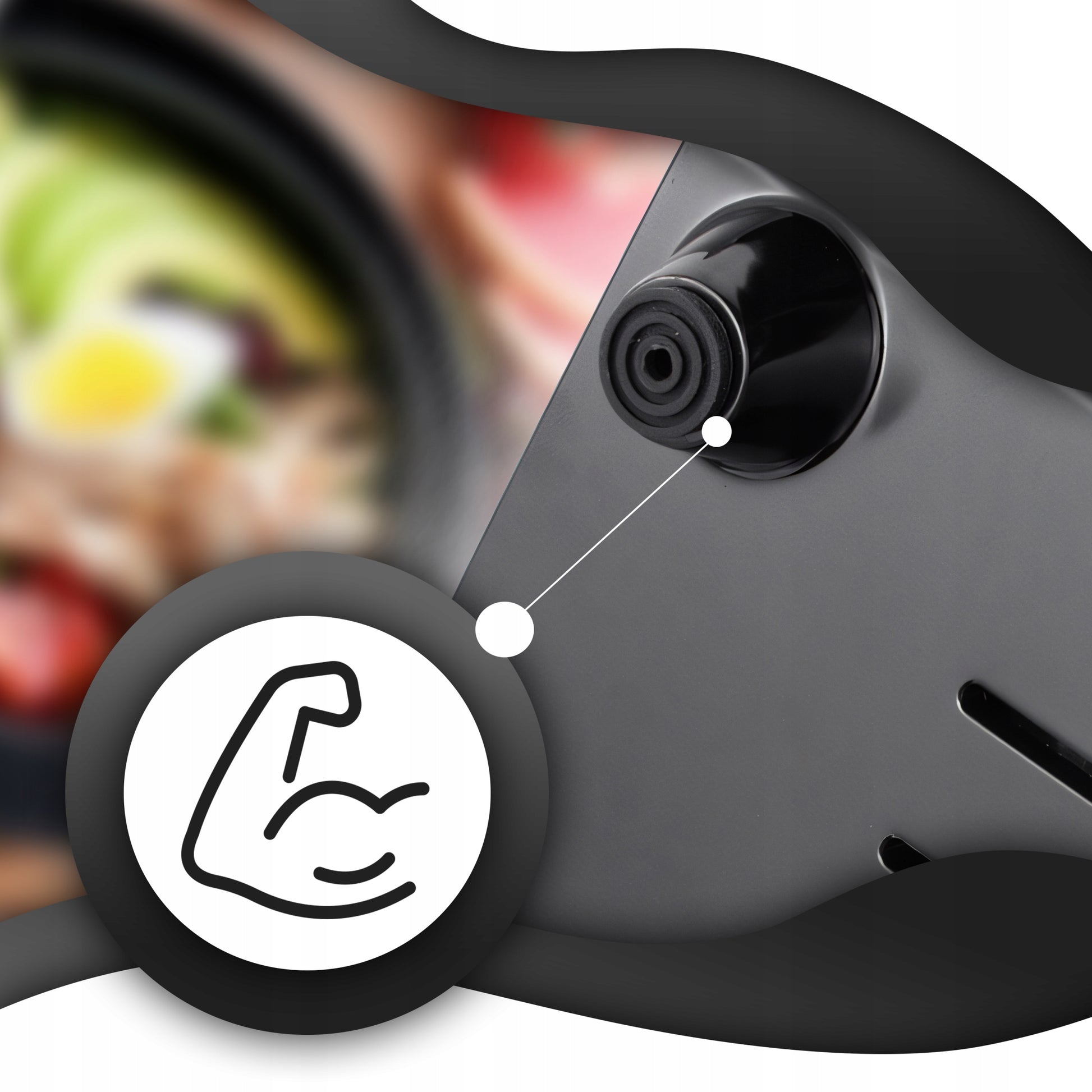 Mūsų prioritetas yra Jūsų saugumas ir komfortas. Neslystanti pagrindas užtikrina stabilumą ant bet kokio paviršiaus, o intuityvūs indikatoriai informuoja apie prietaiso veikimo būseną – kada jis įjungtas ir kada pasiekė optimalią kepimo temperatūrą. Ergonomiška rankena visuomet išlieka vėsi, apsaugodama nuo nudegimų.