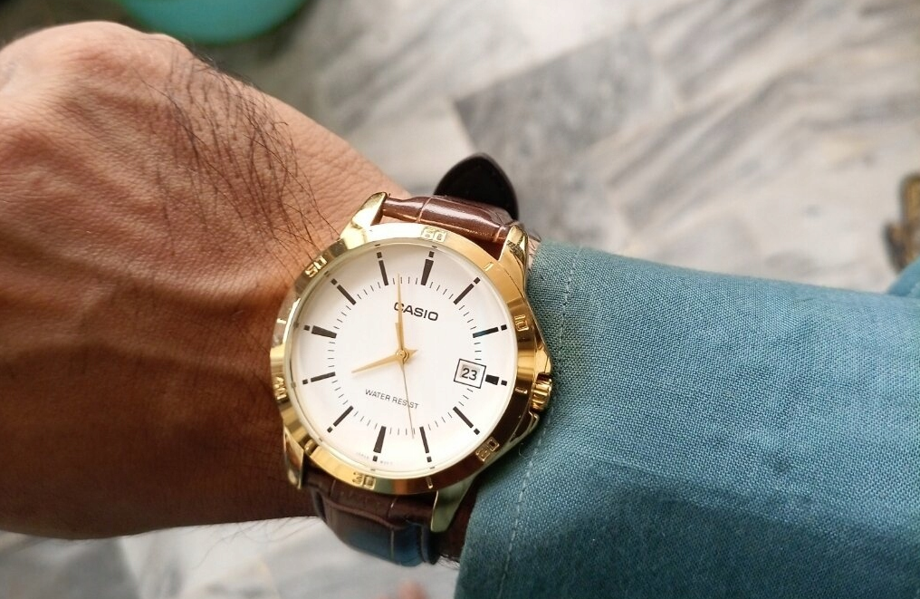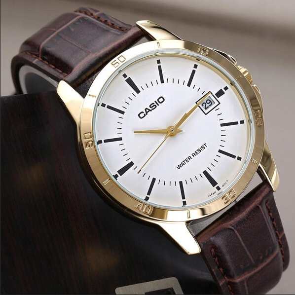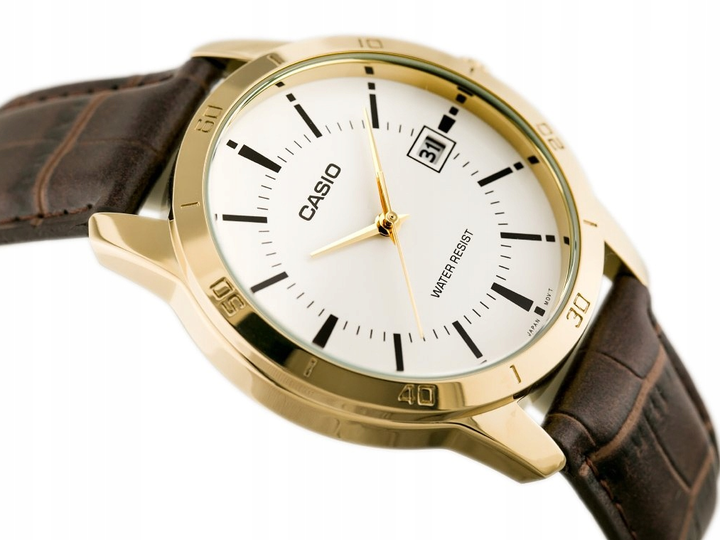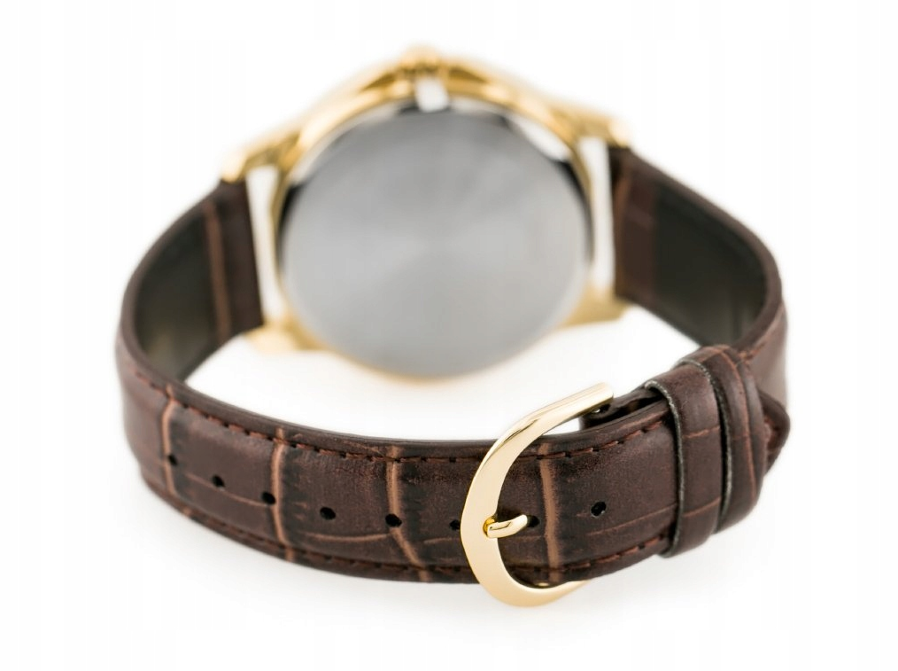 Prabangos kupinas ir stilingas analoginis laikrodis, idealiai tinkantis kasdieniam dėvėjimui. Korpusas su auksinio atspalvio danga (gold tone), baltas ciferblatas ir derantis tamsios odos dirželis sukuria rafinuotą įvaizdį. Laikrodis veikia tiksliu kvarciniu mechanizmu, o mineralinis stiklas apsaugo nuo smulkių įbrėžimų. Papildomai – datų rodymas ir vandens atsparumas.