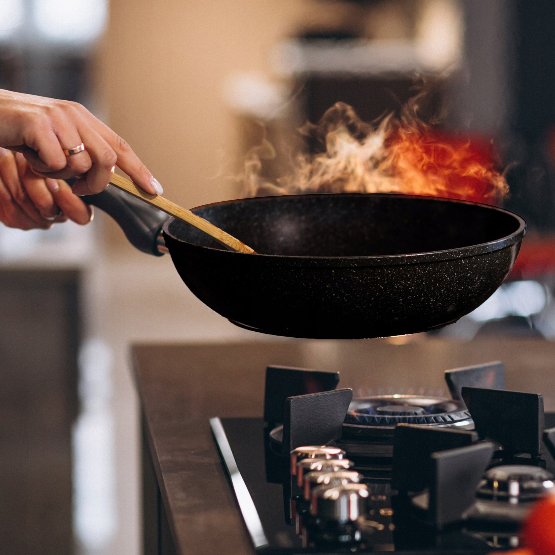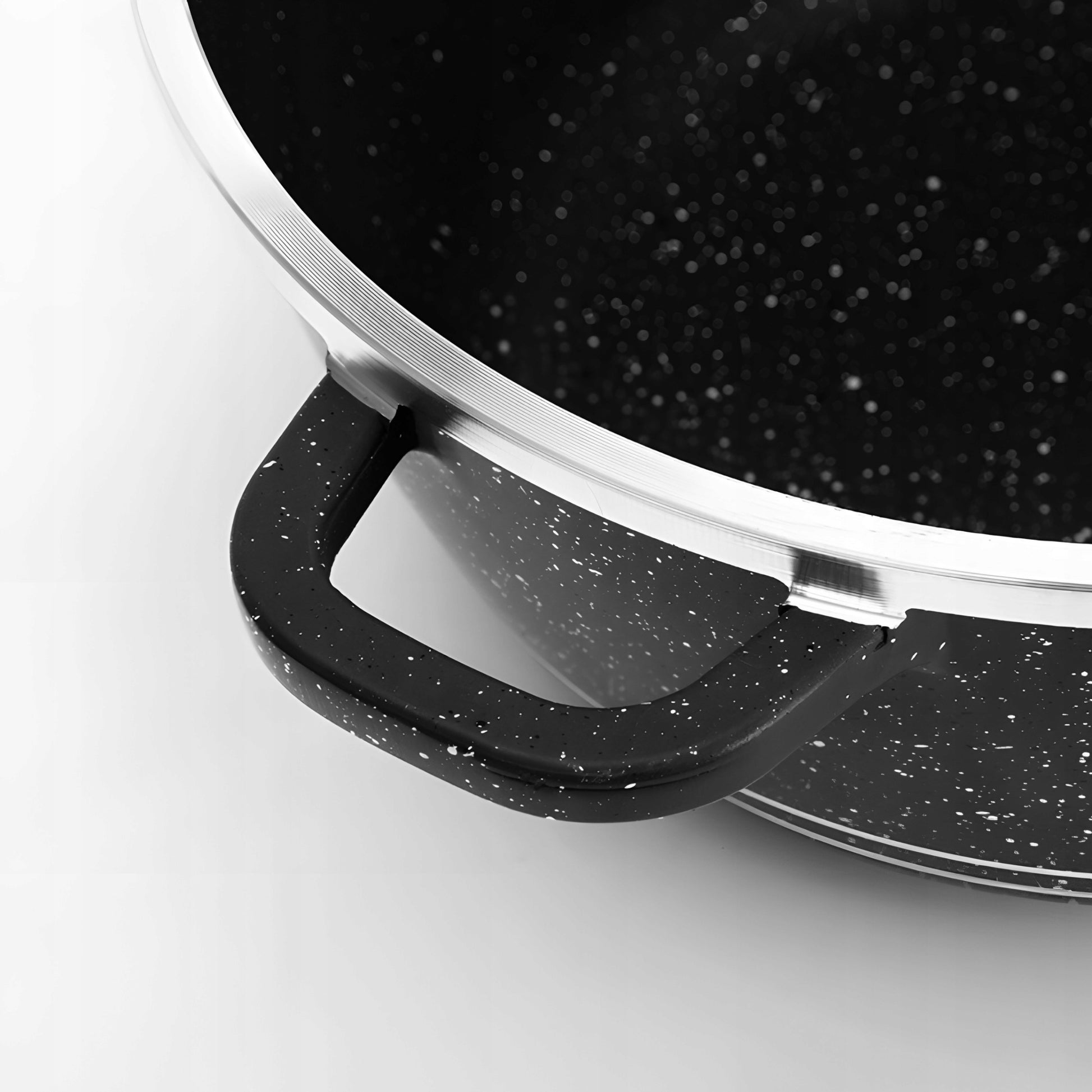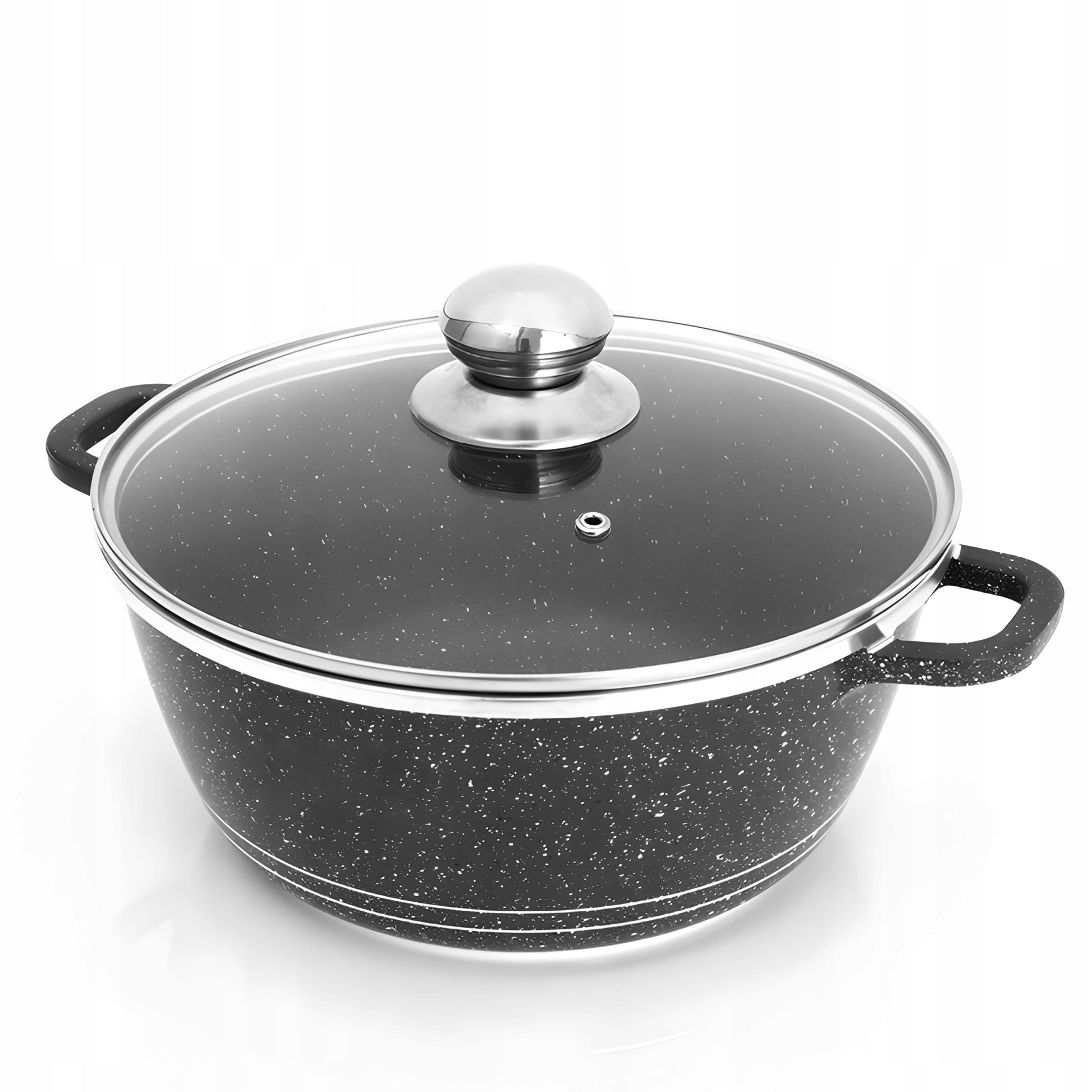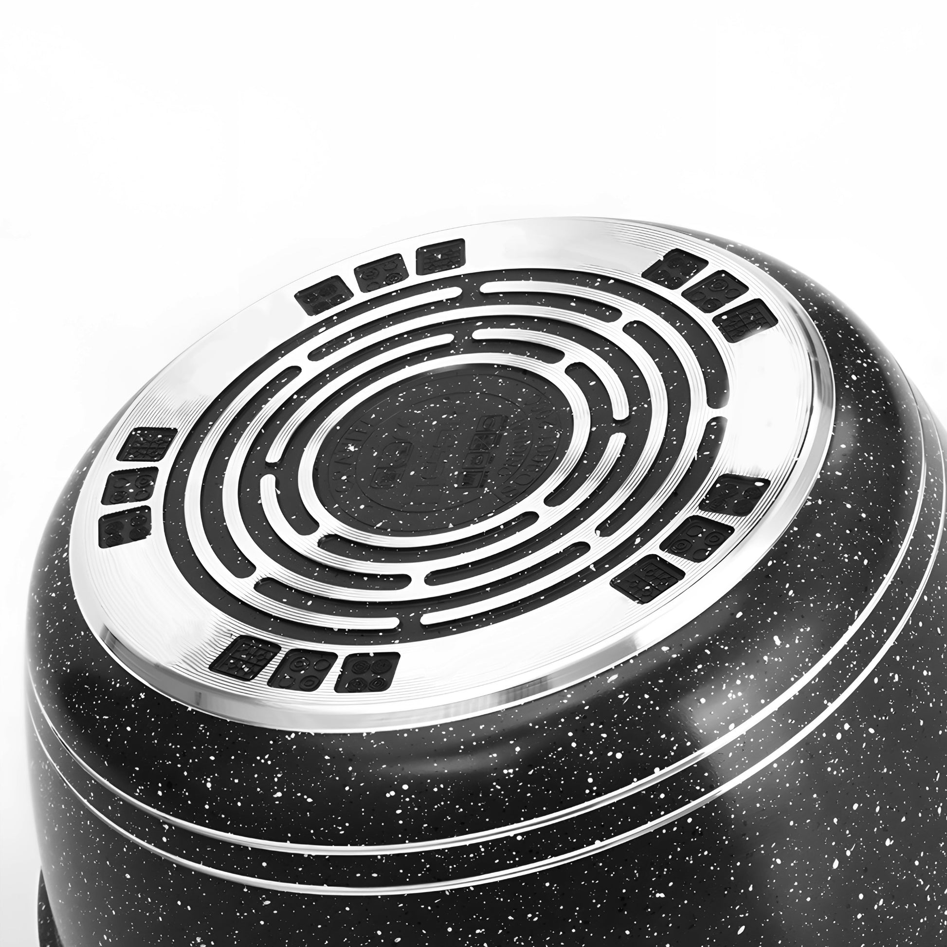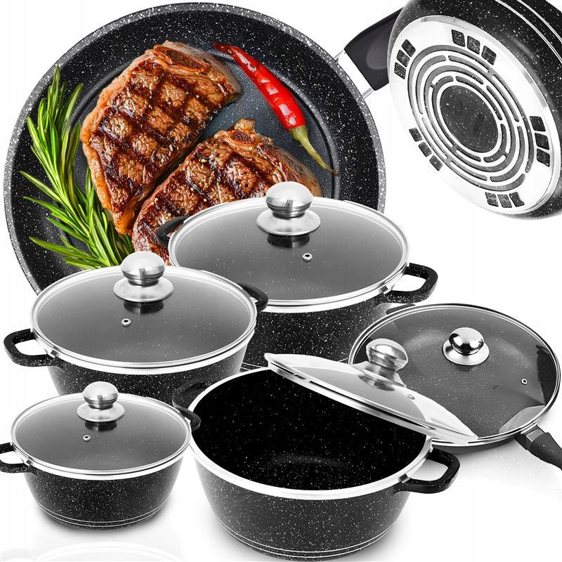 Niekada nesijaudinkite dėl suderinamumo su jūsų virykle. Šis puodų ir keptuvių rinkinys yra universalus ir puikiai veikia ant visų tipų kaitlenčių: dujinių, elektrinių, halogeninių, keramikinių ir net indukciinių. Aliuminio lydinio dugnas užtikrina greitą ir tolygų karščio paskirstymą, o tai garantuoja efektyvų ir nuoseklų maisto gaminimą nepriklausomai nuo jūsų viryklės tipo. Elegantiškas juodas dizainas su subtiliomis baltomis dėmelėmis suteikia virtuvei modernumo ir rafinuotumo.