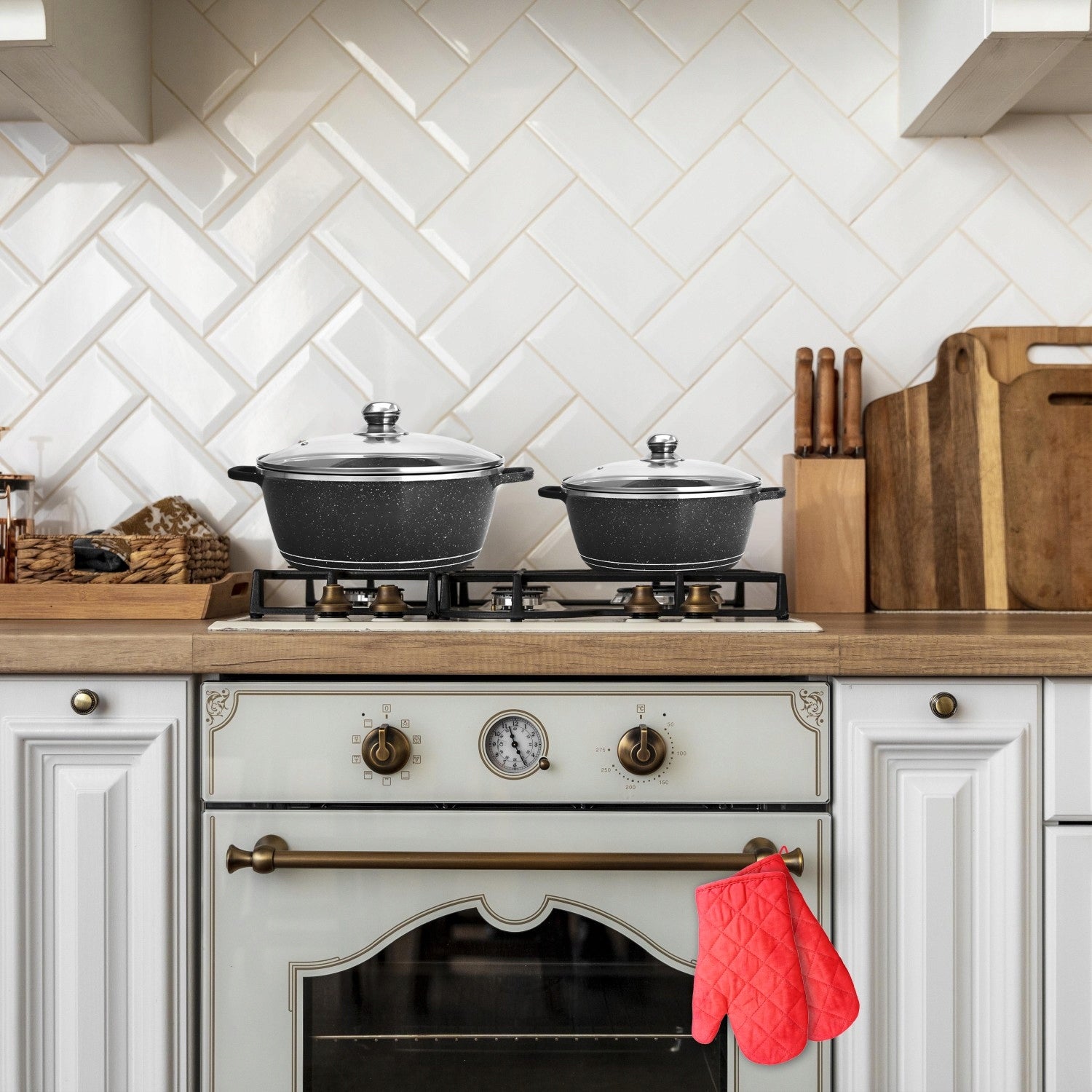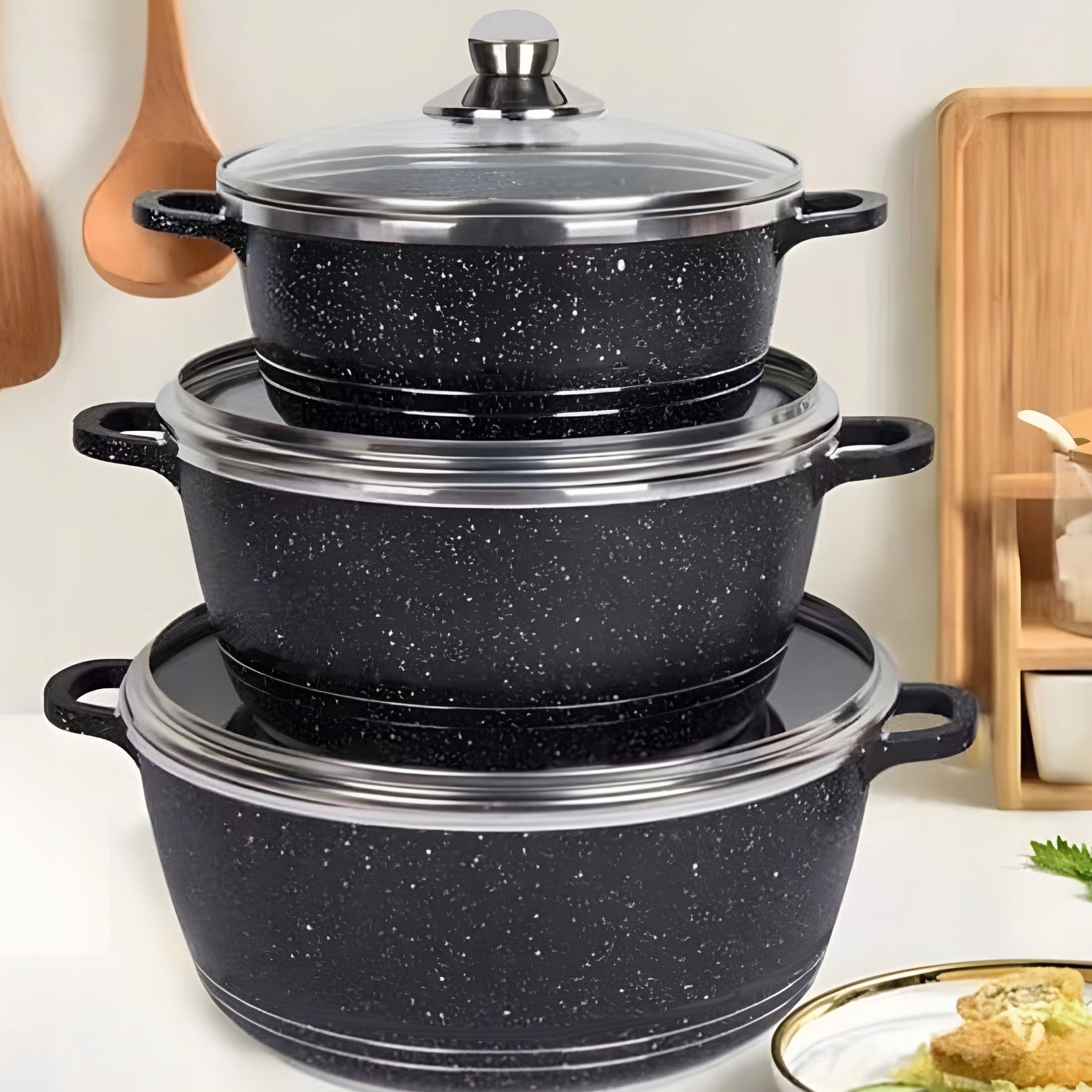 Atraskite naują maisto gaminimo patirtį su šiuo išskirtiniu 12 dalių puodų ir keptuvių rinkiniu. Sukurtas atsižvelgiant į šiuolaikinio namų ūkio poreikius, šis komplektas derina eleganciją, funkcionalumą ir ilgaamžiškumą. Pagamintas iš aukštos kokybės granito lydinio aliuminio, pasižymi tvirta konstrukcija ir ilgu tarnavimo laiku. Dėl specialios marmurinės (keraminės) nepridegančios dangos maistas neįkaista ir nepridega, o maisto gaminimas tampa lengvesnis ir sveikesnis, nes reikia mažiau riebalų. Rinkinys ne tik praktiškas, bet ir suteikia jūsų virtuvei modernumo bei stiliaus.