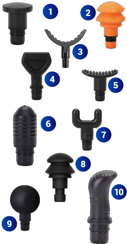 - 10 keičiami antgaliai – tiksliniam įvairių kūno vietų masažui.