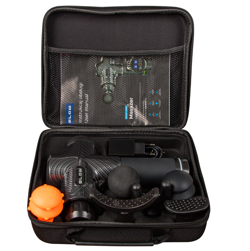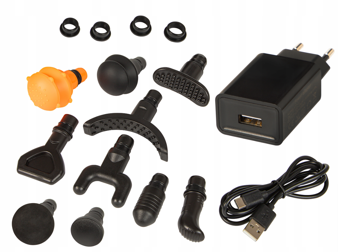 - Komplekte: masažo pistoletas, 10 antgalių, įkroviklis, transportavimo dėklas