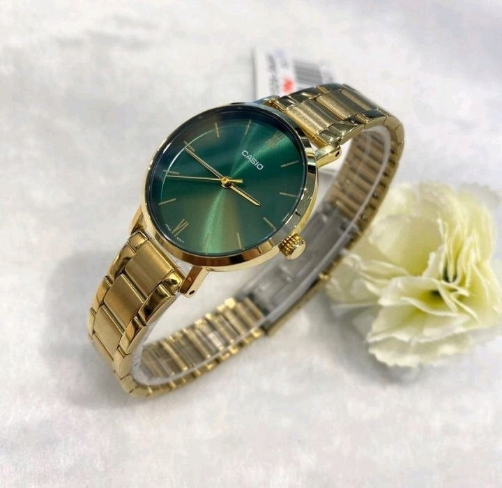 Šis CASIO modelis sukurtas moterims, vertinančioms subtilumą ir funkcionalumą. Žalia ciferblato spalva suteikia gaivumo ir išskirtinumo, o aukso spalvos detalės – korpusas ir apyrankė – akcentuoja prabangą. Laikrodžio korpusas yra kompaktiškas (30 mm pločio ir 8 mm storio), todėl puikiai atrodo ant bet kurios riešo. Nerūdijančio plieno apyrankė (15 mm pločio) yra reguliuojama iki 18 cm ilgio, užtikrinant patogų prigludimą. Dėl WR30 vandeniui atsparios klasės, galite nesijaudinti dėl lengvo kontakto su vandeniu, pavyzdžiui, plaunant rankas. Tai laikrodis, kuris kasdien lydės Jus ir pabrėš Jūsų unikalumą.