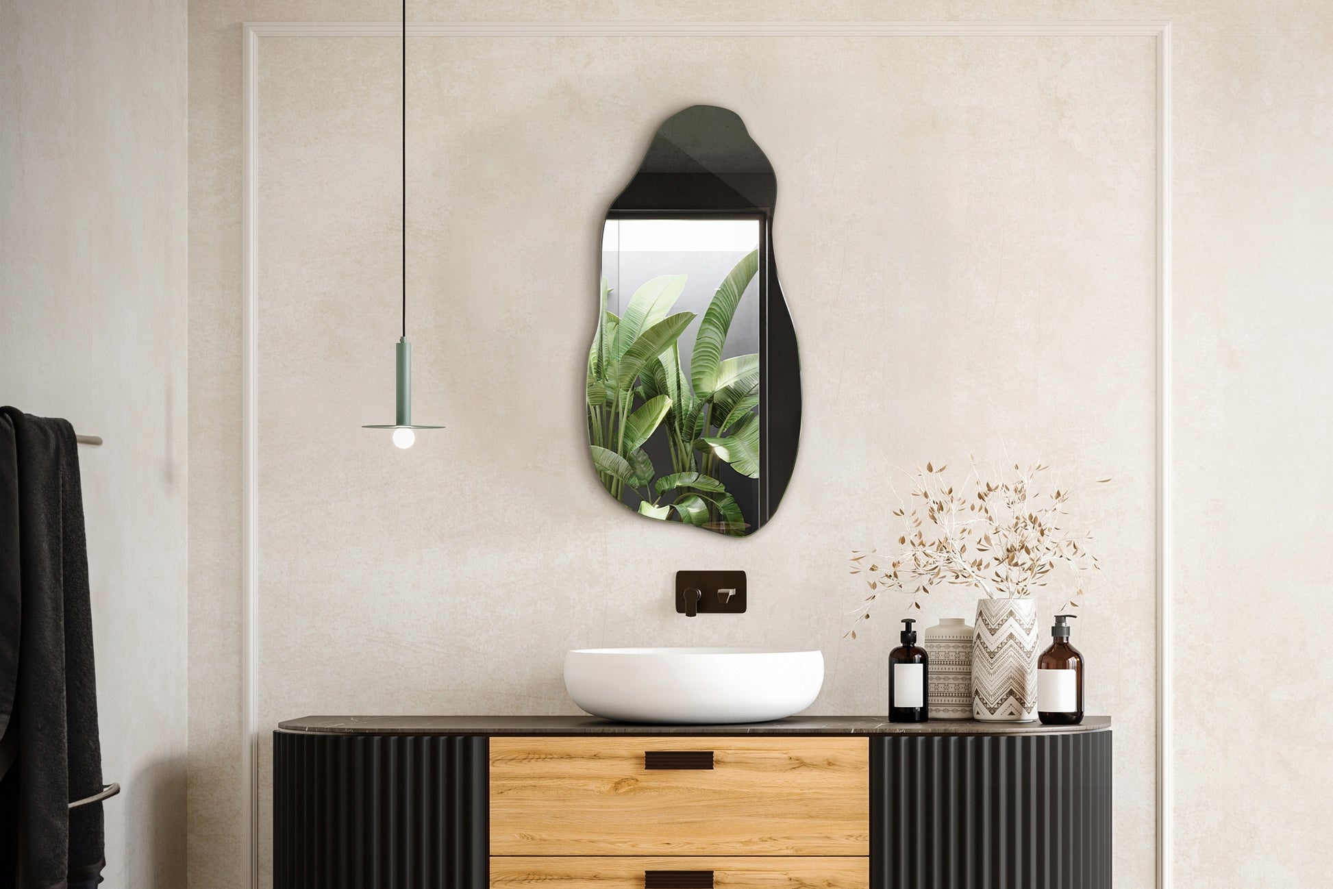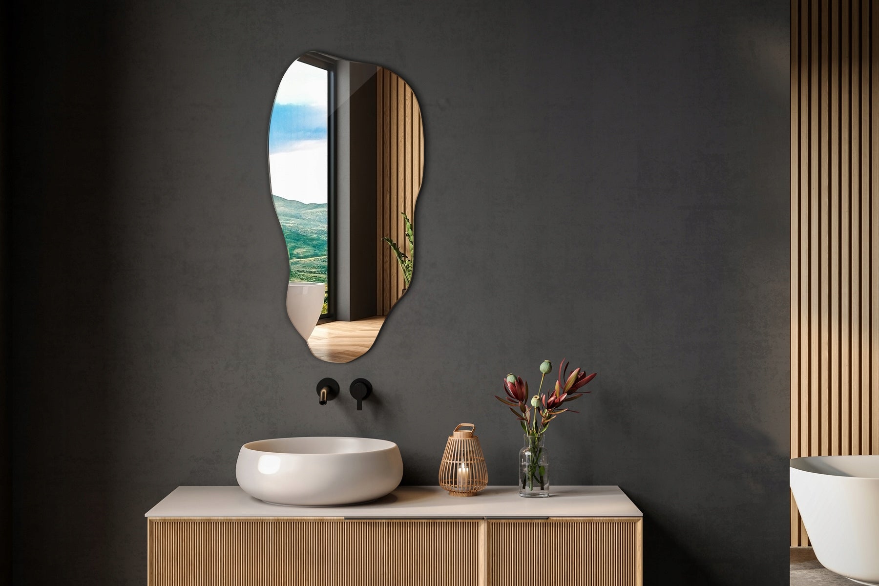 Atraskite originalų akcentą savo interjerui su šiuo išskirtiniu, netaisyklingos formos veidrodžiu. Jo unikalus „lašo“ ar „dėmės“ dizainas suteikia modernumo ir subtilios elegancijos bet kuriai erdvei – ar tai būtų jūsų vonios kambarys, miegamasis, prieškambaris, ar svetainė. Pagamintas iš aukštos kokybės, 4 mm storio skaidraus veidrodžio stiklo, jis pasižymi nepriekaištingai lygia atspindinčia danga ir šlifuotais kraštais, užtikrinančiais ne tik estetiką, bet ir saugumą. Šis veidrodis yra ne tik praktiškas, bet ir puikus dekoratyvinis elementas, gebantis vizualiai padidinti erdvę ir atspindėti šviesą, sukuriant jaukesnę atmosferą.