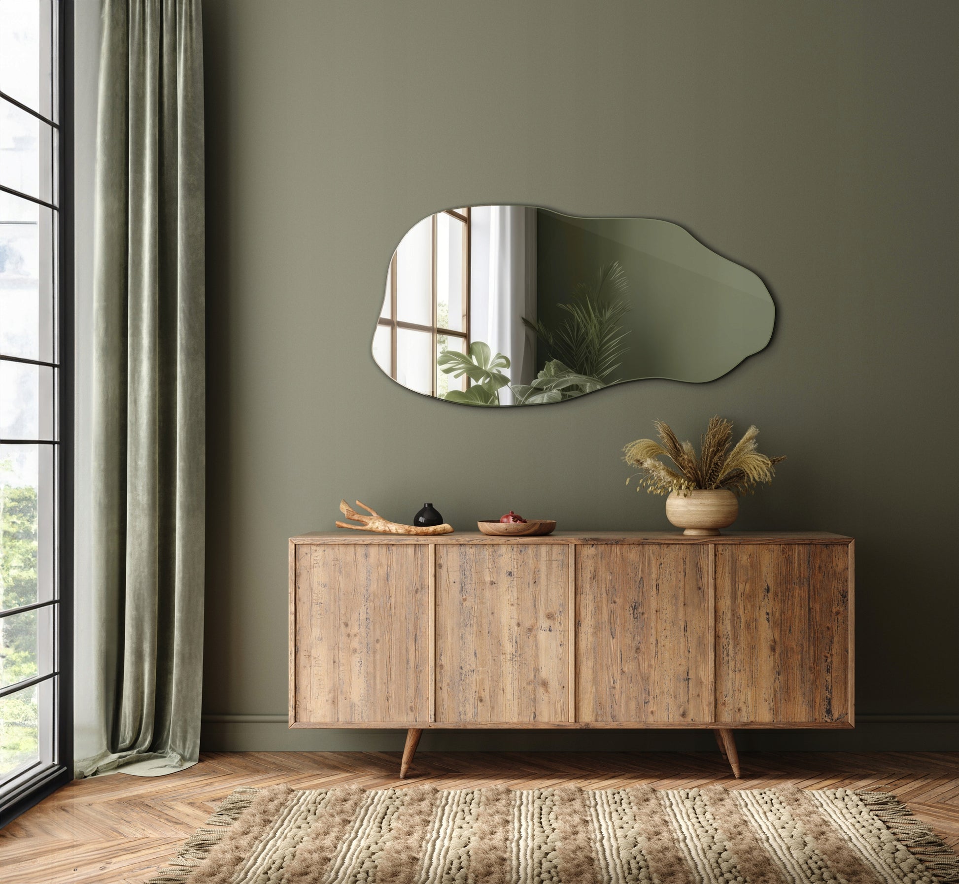 Šis organiškos formos veidrodis yra unikalus dėl savo netaisyklingo, minimalistinio dizaino, kuris lengvai dera prie įvairių interjero stilių, nuo modernaus iki skandinaviško ar bohemiško. Jo formos laužo tradicines taisykles, suteikdamos patalpai dinamiškumo ir originalumo. Dėl savo universalaus dydžio (45 cm x 90 cm) jis puikiai tinka tiek didesnėms, tiek mažesnėms patalpoms. Veidrodis gali būti montuojamas tiek vertikaliai, tiek horizontaliai, leidžiantis pritaikyti jį pagal individualius poreikius ir erdvės išplanavimą, kas daro jį itin lankščiu sprendimu.