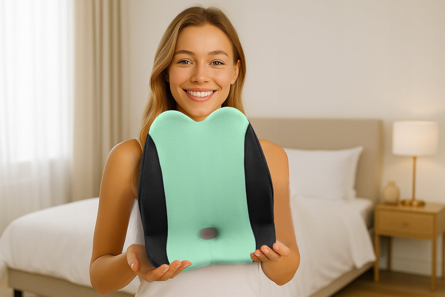 - Patogus tvirtinimas: Reguliuojamas diržas leidžia tvirtai pritvirtinti pagalvėlę, kad ji išliktų savo vietoje.
