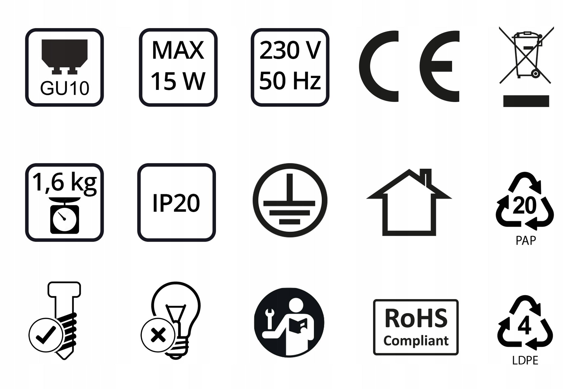 - Lemputės neįtrauktos: Papildomai reikės įsigyti GU10 tipo LED lemputes, atsižvelgiant į pageidaujamą galią, šviesos spalvą ir srovę.