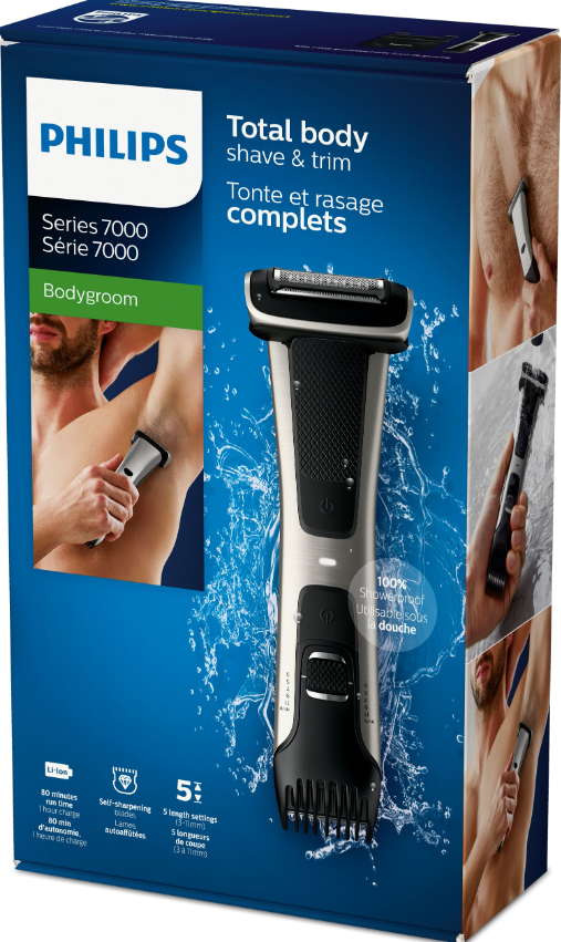 Philips BG7025 – patogus įrankis viso kūno plaukų priežiūrai. Prietaisas turi dvi puses: viena skirta švariai nuskusti, kita – patrumpinti plaukus iki norimo ilgio. Reguliuojamas antgalis leidžia pasirinkti 5 skirtingo ilgio nustatymus nuo 3 iki 11 mm. Peiliukai švelniai slysta oda, o speciali apsauginė folija užtikrina komfortą net jautriose vietose.