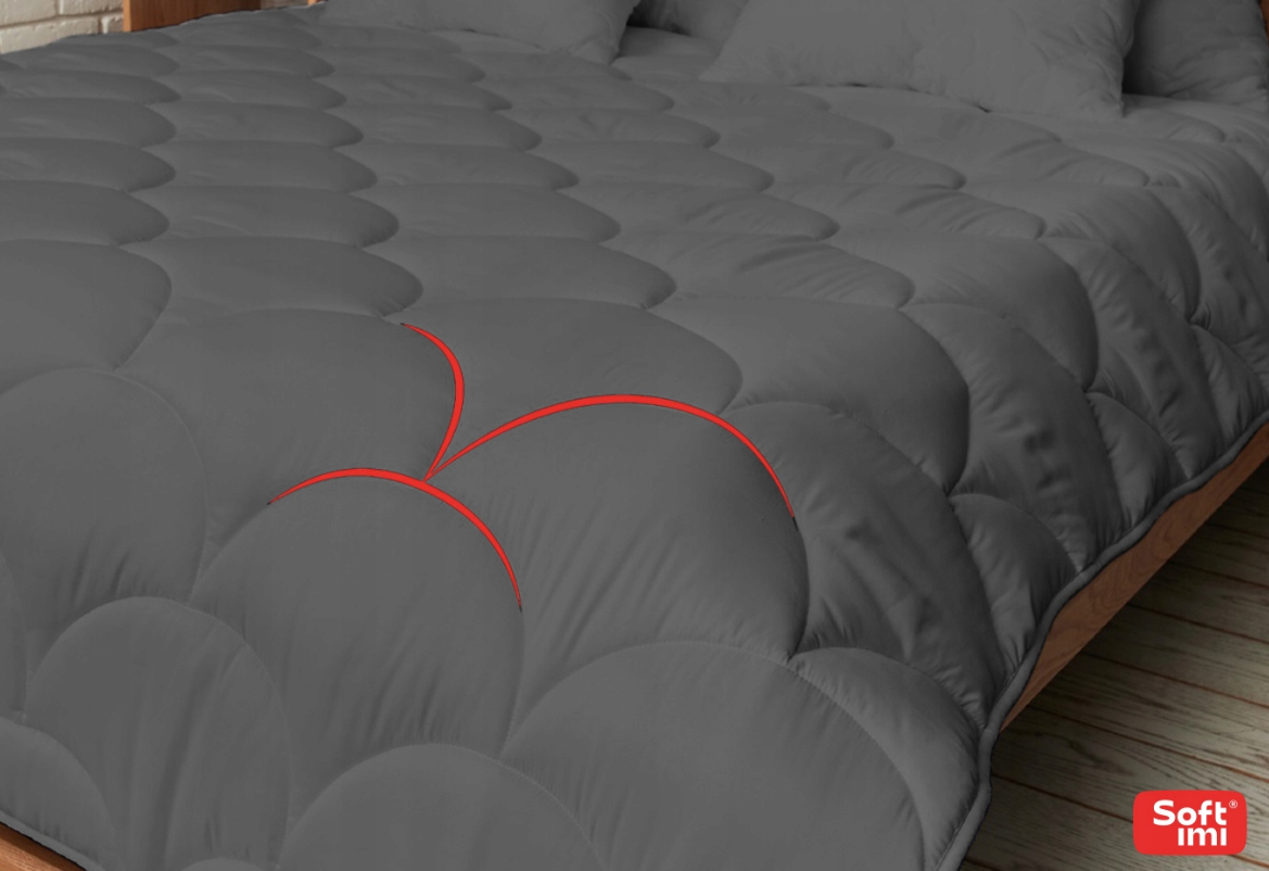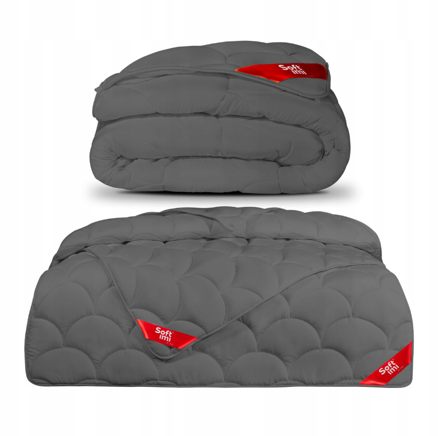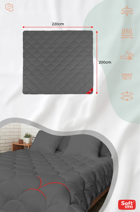 Pilkos spalvos, 4 sezonų antialerginė antklodė (200 × 220 cm) – švelni, šilta ir lengva, su puriu silikoniniu užpildu, užtikrinančiu komfortą be alergijos rizikos ir nepriekaištingą formos stabilumą.