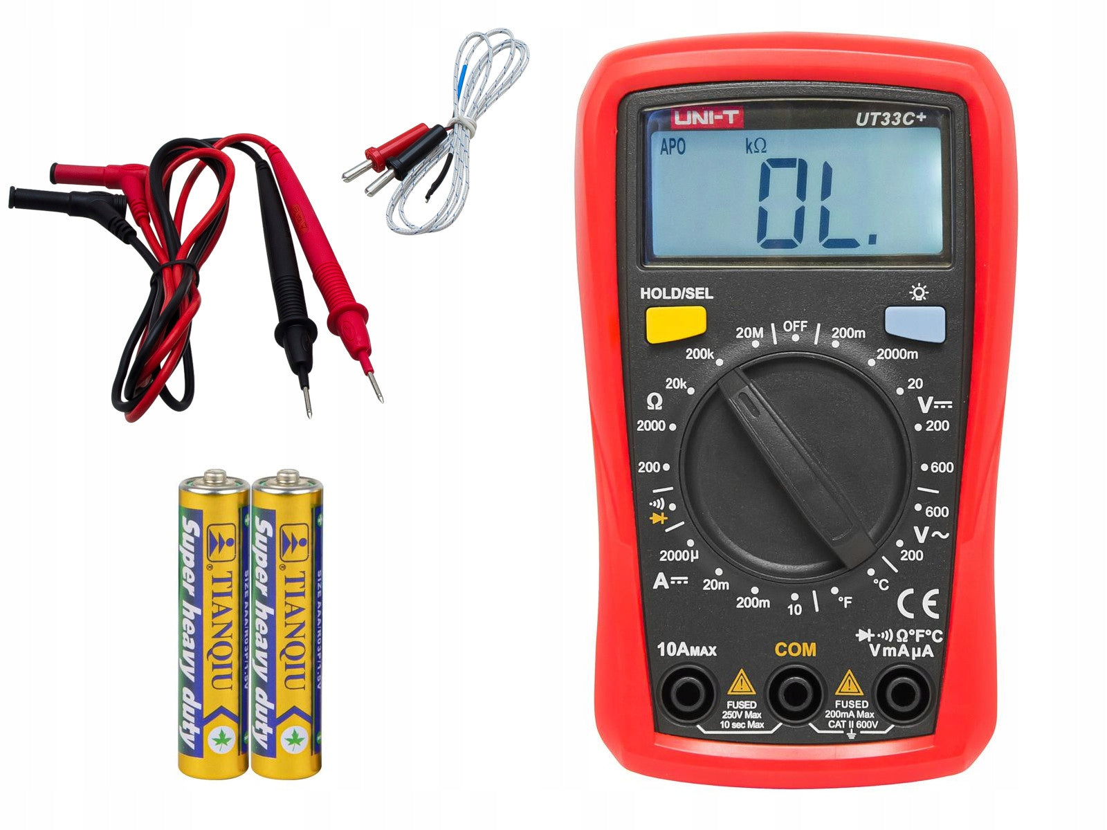 Kad galėtumėte iškart pradėti darbus, multimetras UT33C+ parduodamas su viskuo, ko reikia: pačiu matuokliu, jau įdėtomis baterijomis, būtinais bandymo laidais ir specialia temperatūros zondais. Visos šios dalys kruopščiai supakuotos, užtikrinant, kad gausite pilną ir paruoštą naudojimui komplektą.