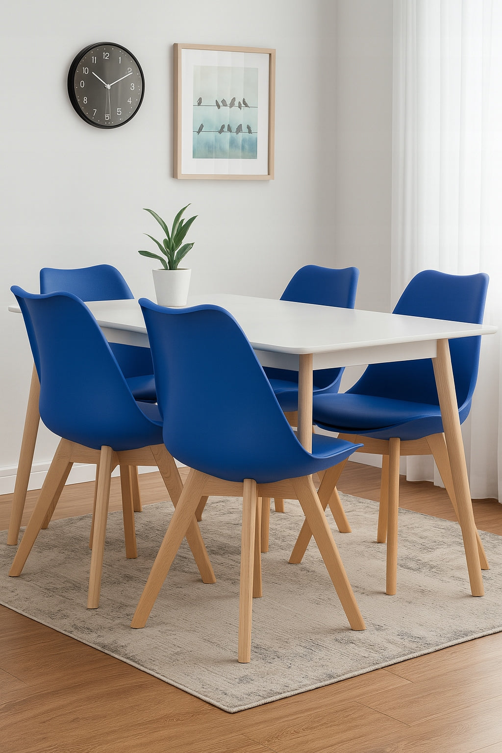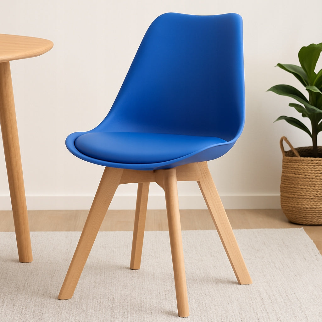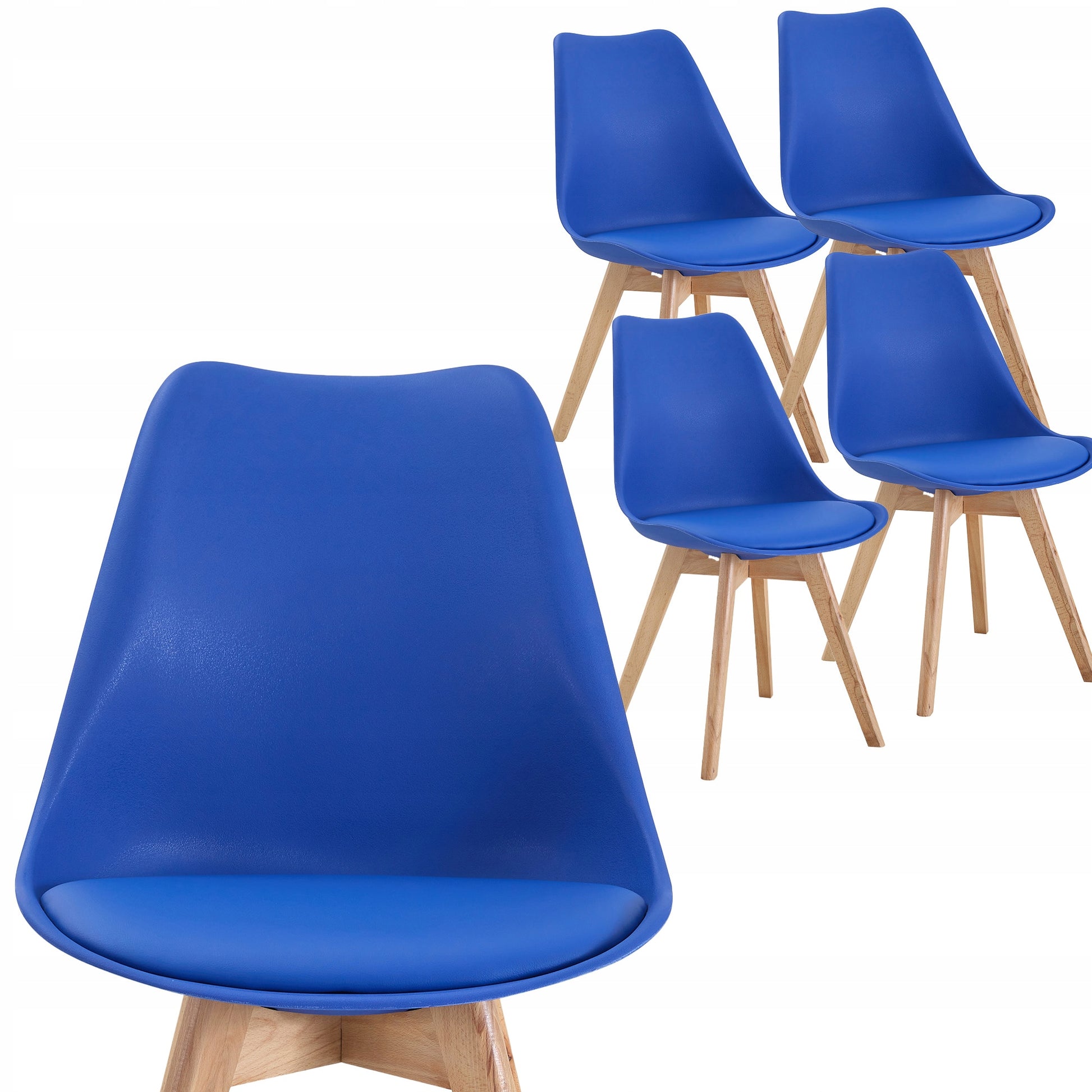 - 4 x Mėlynos spalvos skandinaviško stiliaus kėdės su integruota pagalvėle.