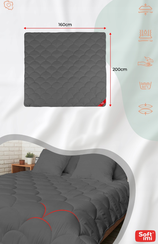 Mėgaukis visuomet idealiu komfortu su Softimi antialergine antklode „4 sezonai“. Ši pilka, visų metų antklodė sujungia lengvą audinį ir pūkui prilygstantį silikonizuotą pluoštą, kuris palaiko šilumos balansą tiek vasarą, tiek žiemą. Dygsniavimo sistema „No Move System“ stabilizuoja užpildą, o aukštos kokybės mikropluošto medžiaga yra švelni, kvėpuojanti ir puikiai tinkama jautrios odos savininkams. Idealus pasirinkimas norintiems švaros, purumo ir ilgalaikio patogumo.