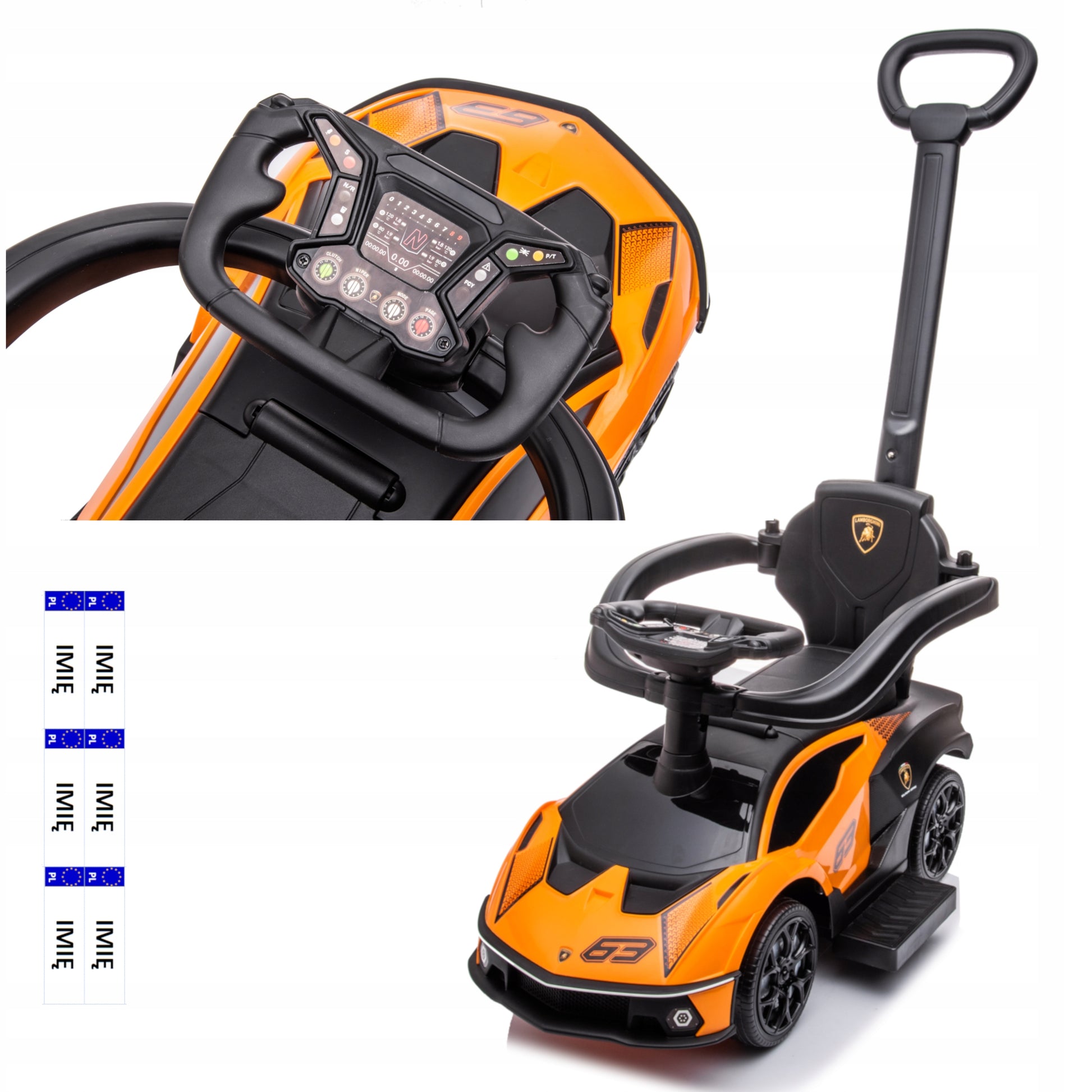 Vaikiškas paspiriamas automobilis su rankena LAMBORGHINI 3in1, žaislinis automobilis, sėdynė iš ekoodos