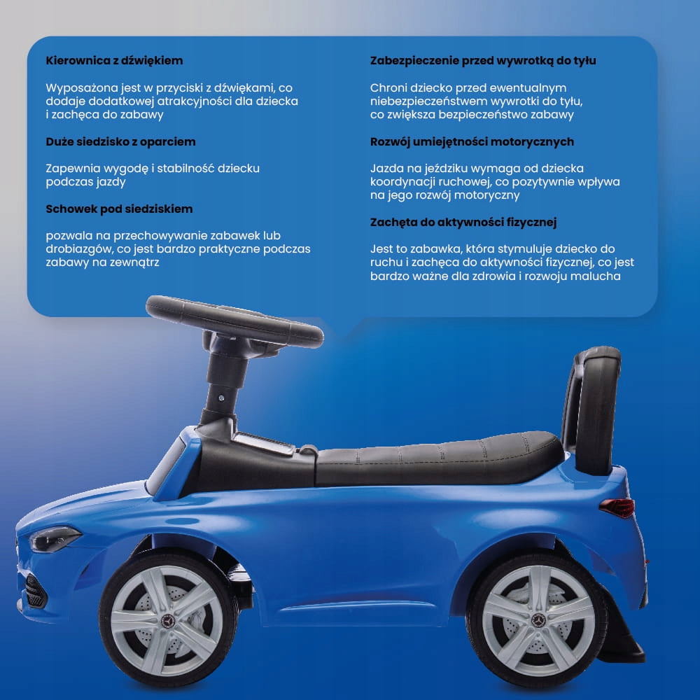 Šis vaikiškas stumdukas sukurtas atsižvelgiant į smulkiausias detales, kad atkartotų tikrąjį „Mercedes-Benz C-Class“ automobilį. Mažieji vairuotojai bus sužavėti realistiško dizaino, kuris skatina vaizduotę ir vaidmenų žaidimus. Be to, kad atrodo stilingai, šis stumdukas yra itin funkcionalus: jame yra integruotas skyrelis smulkiems daiktams ar mėgstamiausioms žaislų laikyti, o tai ypač praverčia keliaujant ar žaidžiant lauke. Saugumas visada yra prioritetas, todėl stumdukas turi specialią apsaugą nuo apsivertimo atgal, užtikrinančią stabilumą ir saugią važiavimo patirtį kiekvienam vaikui.