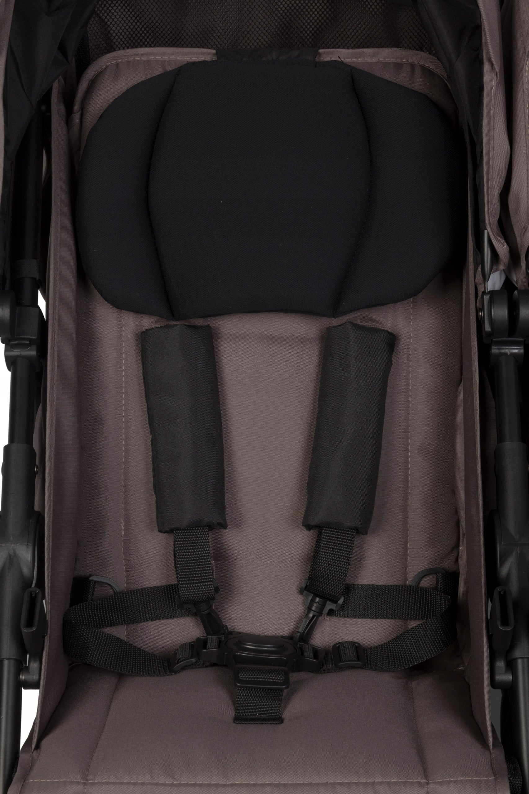 - Nepriklausomos sėdimosios dalys: Kiekviena dalis turi individualų atlošo, pakojo ir stogelio reguliavimą, leidžiantį pritaikyti padėtį kiekvienam vaikui atskirai.