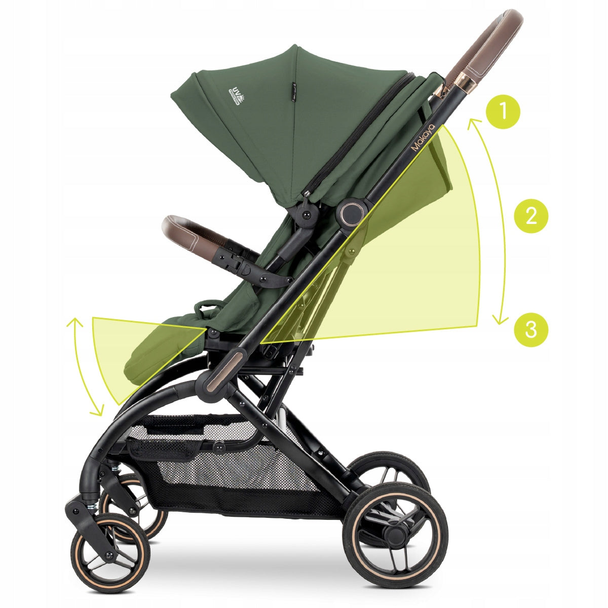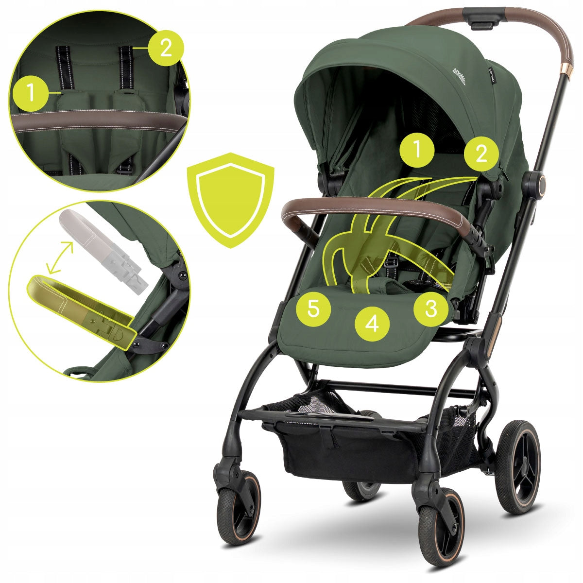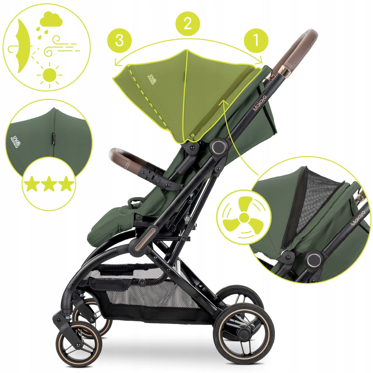 Lorelli Makaya turi daugia pozicijų atlošą ir reguliuojamą kojų atramą, leidžiančią sukurti visiškai atsigulusią padėtį miego, ar patogią sėdėjimo padėtį žaidžiant. Tai padeda išvengti vaiko slydimo miego metu ir užtikrina optimalią atramą. Erdvi, reguliuojama stogelio dalis su integruotu ventiliaciniu tinkleliu apsaugo nuo saulės spindulių ir užtikrina gerą oro cirkuliaciją karštomis dienomis, neleidžiant sėdimajai daliai perkaisti. 5 taškų saugos diržai su aukščio reguliavimu užtikrina, kad mažylis visuomet bus saugiai prisegtas.