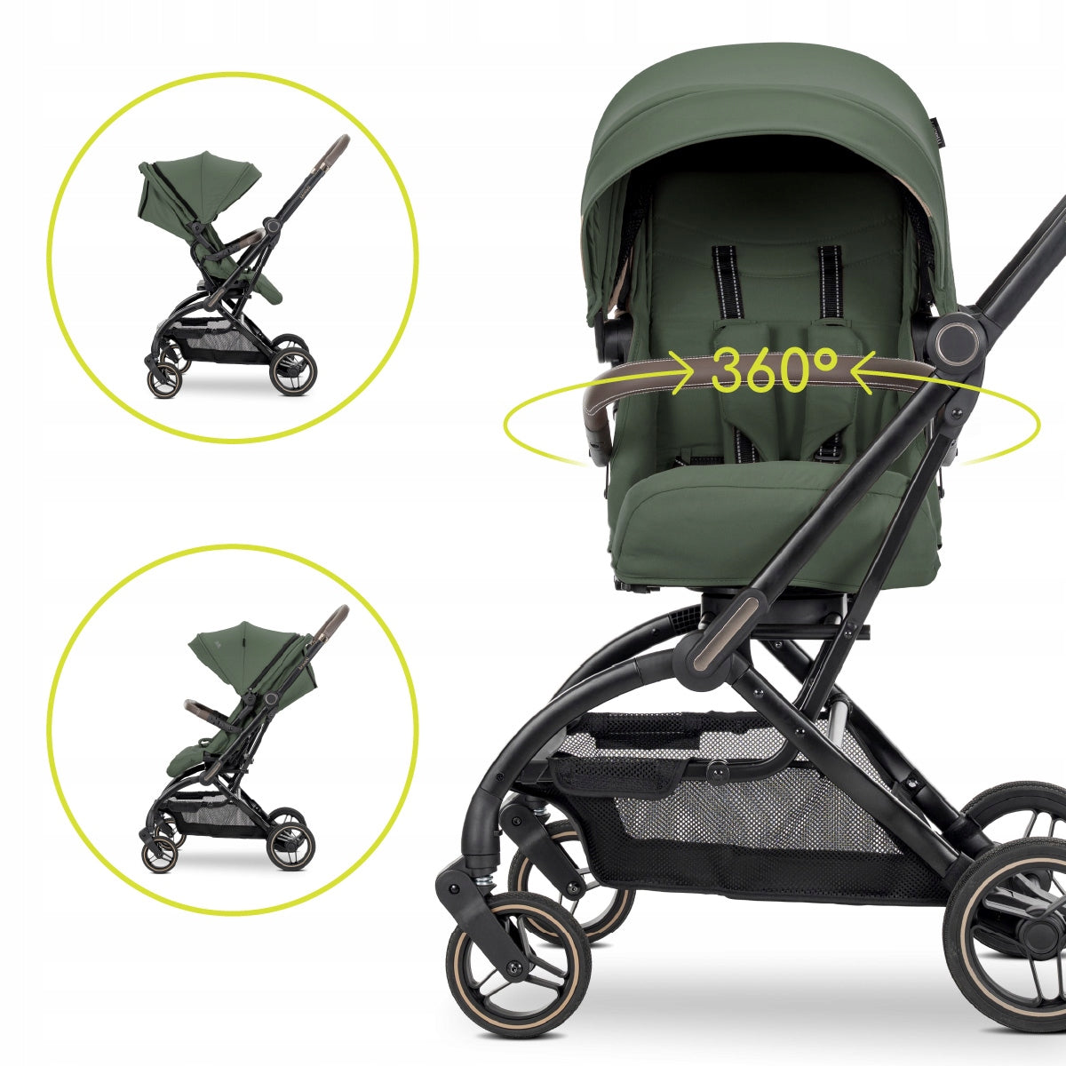- Dviračio sėdynės pasukimas 360°: Leidžia lengvai keisti vaiko padėtį (veidu ar nugara į tėvus).