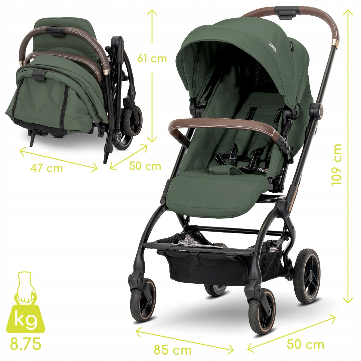 - Viena ranka sulankstomas: Itin patogu tėvams, kai rankos užimtos.