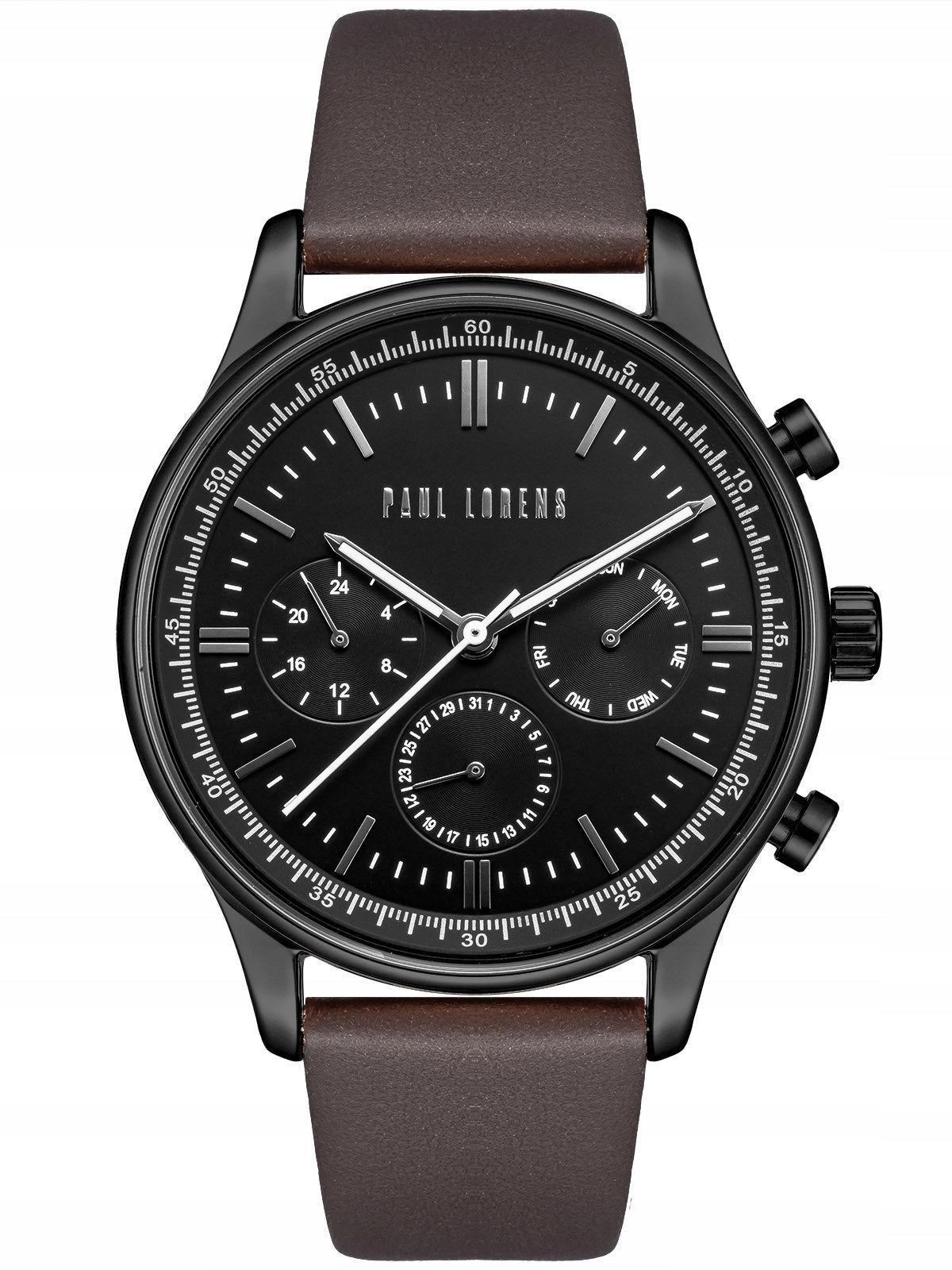 Pasirinkdami Paul Lorens zg362c, Jūs pasirenkate ne tik laikrodį, bet ir išskirtinį stiliaus elementą. Klasikinis apvalus, 44 mm pločio ir tik 9 mm storio korpusas pagamintas iš juodo nerūdijančio plieno, elegantiškai priglunda prie riešo. Prie jo derantis rudas, natūralios odos dirželis, kurio plotis svyruoja nuo 22 mm prie korpuso iki 18 mm ties sagtimi, suteikia laikrodžiui rafinuotumo. Sidabrinis ciferblatas su juodais indeksais ir rodyklėmis yra lengvai skaitomas, o subtilios detalės, tokios kaip juodi mėnesio ir savaitės dienos rodikliai bei 24 valandų indikatorius, suteikia laikrodžiui išbaigtumo. Didžiausias apyrankės apimtis siekia apie 20 cm, todėl tiks įvairaus dydžio riešams.