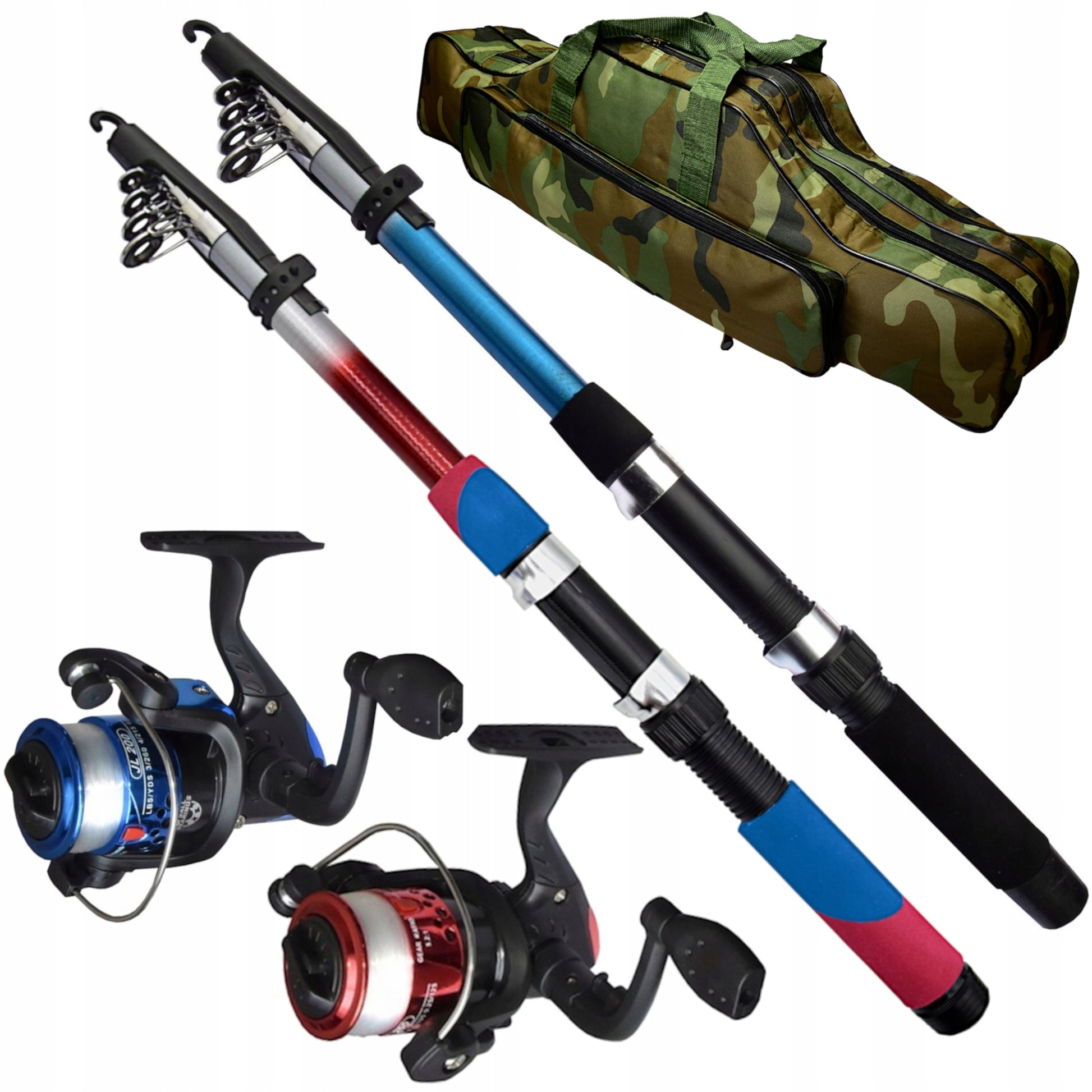 Žvejybos rinkinys 2x meškerė 2x ritė krepšys tinklas stovai jaukas priedai